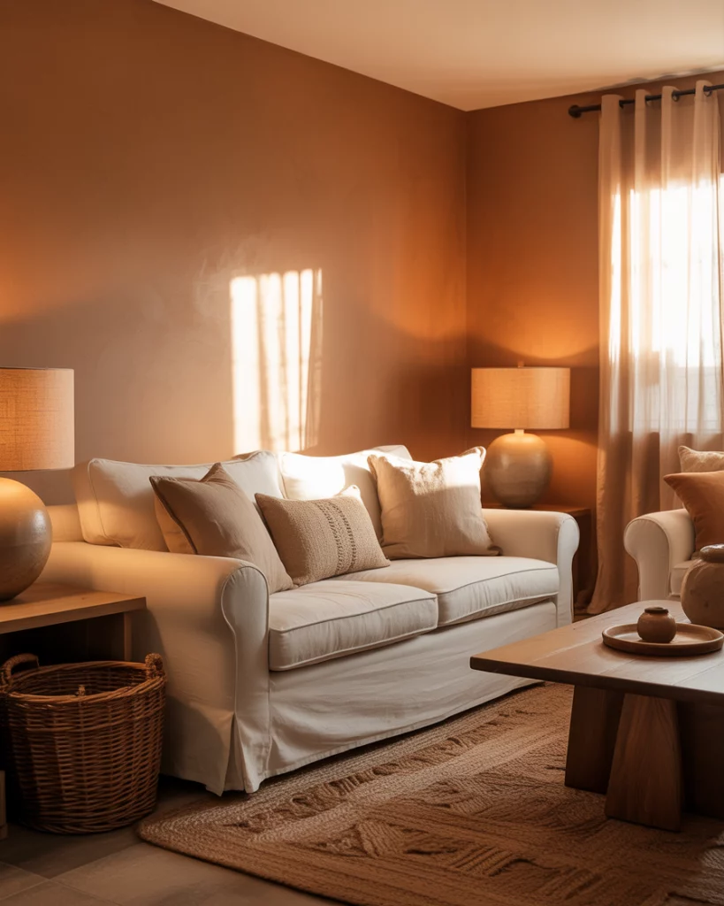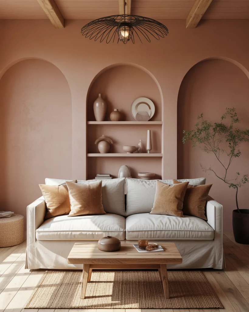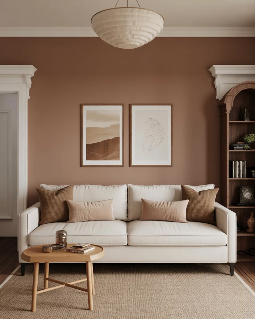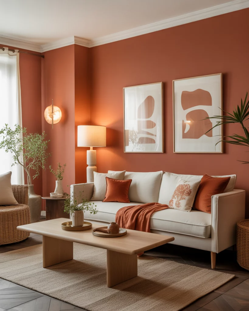 Earthy palette ideas keep leading 2026 trends, and warm clay tones are taking center stage. This shade—somewhere between terracotta and peach—creates a welcoming, sunlit feel in your living room. Paired with linen, jute, and wool textures, it’s a combination that feels grounded and cozy. Sherwin Williams lists clay tones as ideal for spaces that need warmth without darkness. It’s a great scheme idea for those who love rustic yet modern interiors.