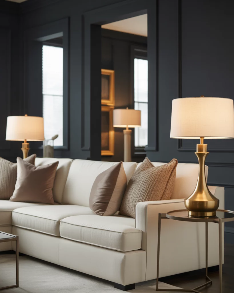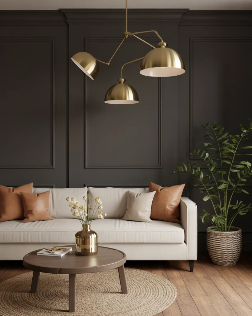 A bold 2026 statement: moody charcoal walls accented with metallic decor and light upholstery. This combination creates a modern-luxe atmosphere while remaining cozy. Add brass lamps, mirrors, or warm light fixtures for contrast. According to Sherwin Williams, darker tones like charcoal or blackened grey can act as neutrals when balanced with reflective textures. The result is dramatic yet livable—perfect for evening lounging.