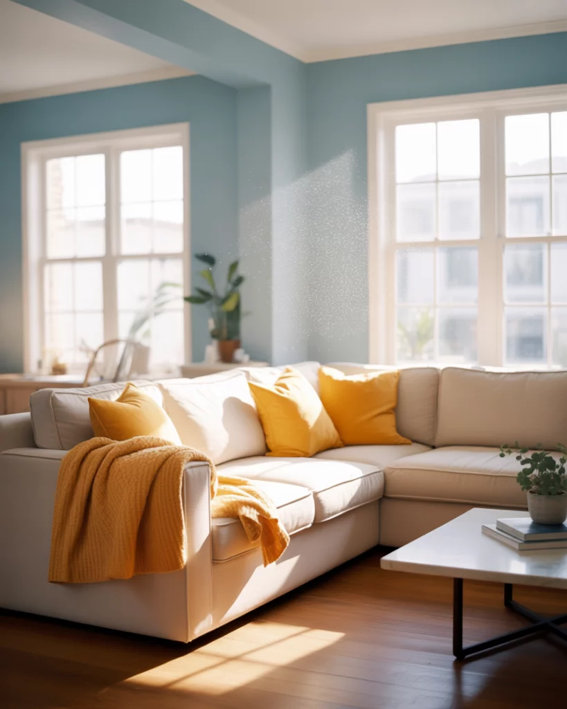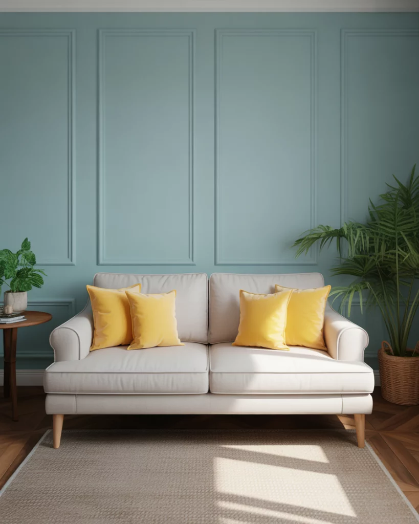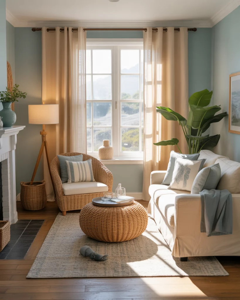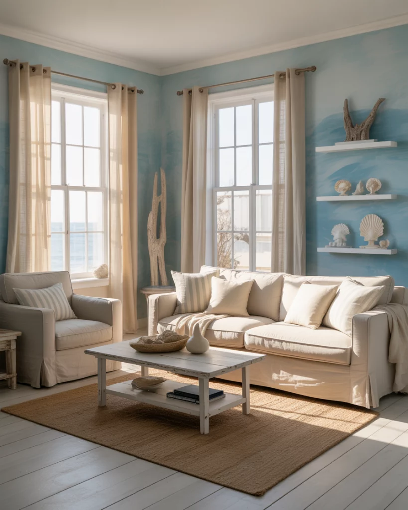 For a palette that feels like the beach without being themed, combine muted blue walls with sandy beige upholstery. This scheme idea uses contrast and calm to create serenity. Add driftwood frames or linen curtains for texture. It’s one of those palette ideas that feels airy, natural, and great for anyone who loves seaside designs. This combination especially suits homes with large windows and lots of sunlight.