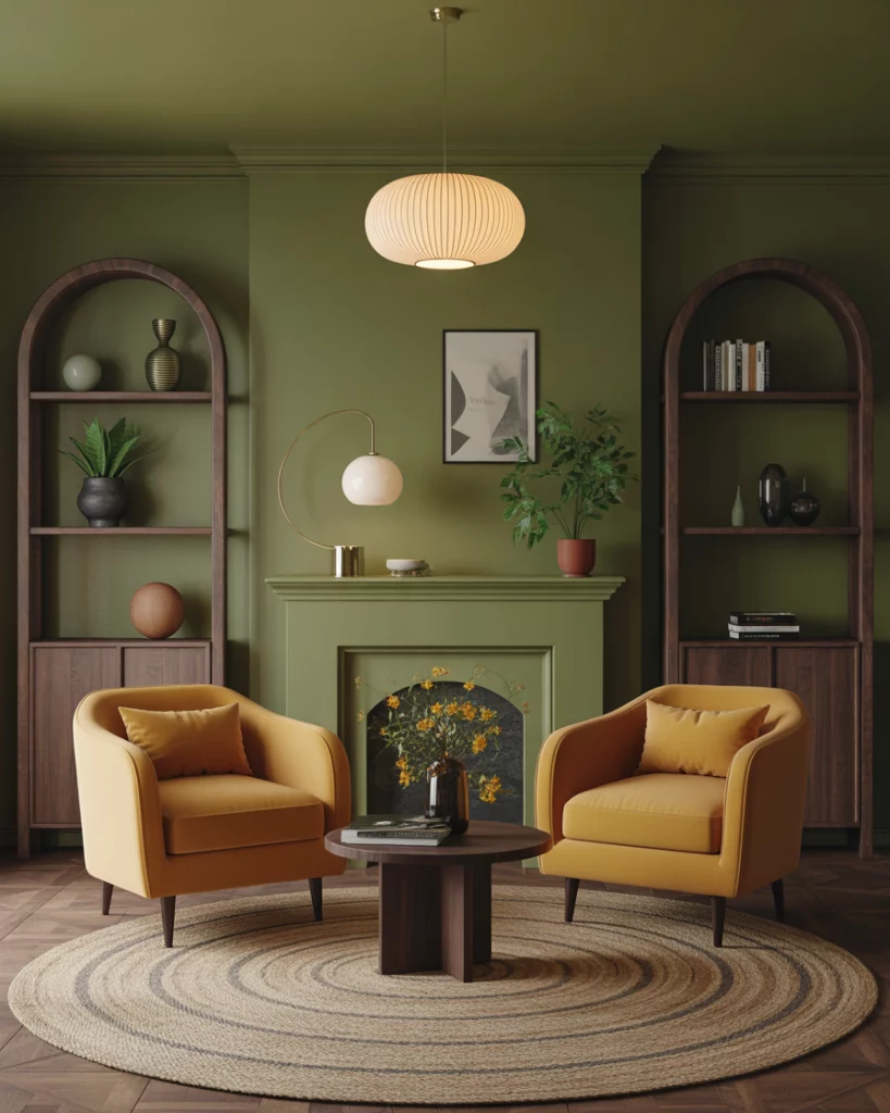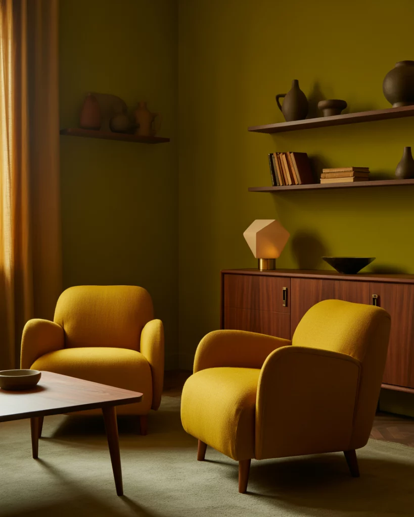 Designers predict a revival of 1970s-inspired hues—particularly mustard and olive combinations. This nostalgic palette feels cozy, confident, and joyful. Pair mustard accent chairs with olive walls or vice versa for a scheme idea that’s full of personality. Benjamin Moore color experts say retro shades are returning with softer edges, making them suitable even for contemporary homes.