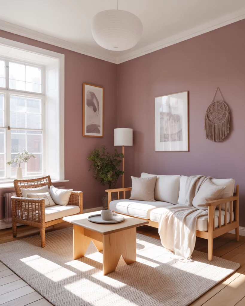 To create a living room ambiance that feels serene and simultaneously chic, consider a subtle pink-beige base wall color with wooden and rattan accents. This creates a palette that feels modern yet warm. Designers suggest pale pinks are becoming the new warm neutral. The combination of pink-beige walls, a brown couch, a natural wood coffee table, and green plant accents gives a balance of softness and texture. This kind of scheme idea works beautifully in living rooms with lots of natural light.