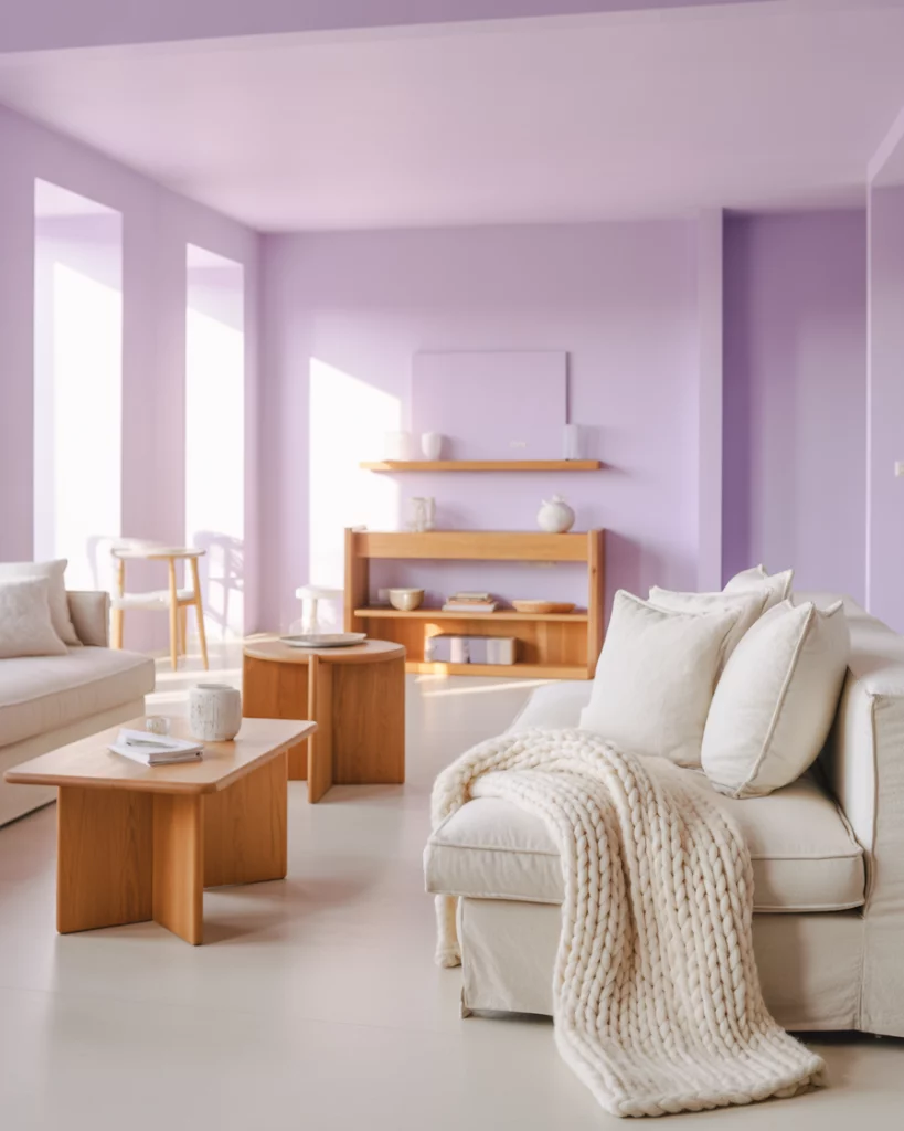 For those seeking a touch of whimsy, lilac walls combined with natural oak floors or furniture offer a gentle yet playful combination. This 2026 scheme idea transforms a plain living space into something uplifting. The palette ideas work particularly well with white or beige textiles. The effect is airy, light, and relaxing—perfect for people who want color without intensity.