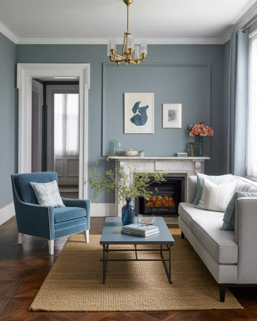 This 2026 favorite blends sophistication with creativity: blue-grey walls paired with abstract art and minimalist furniture. The combination is calm yet expressive, giving you room to showcase personality through designs and decor. It’s ideal for modern apartments or homes where you want visual depth but prefer subdued hues. Benjamin Moore colorists say these palette ideas work especially well with metal or glass surfaces for a crisp finish.