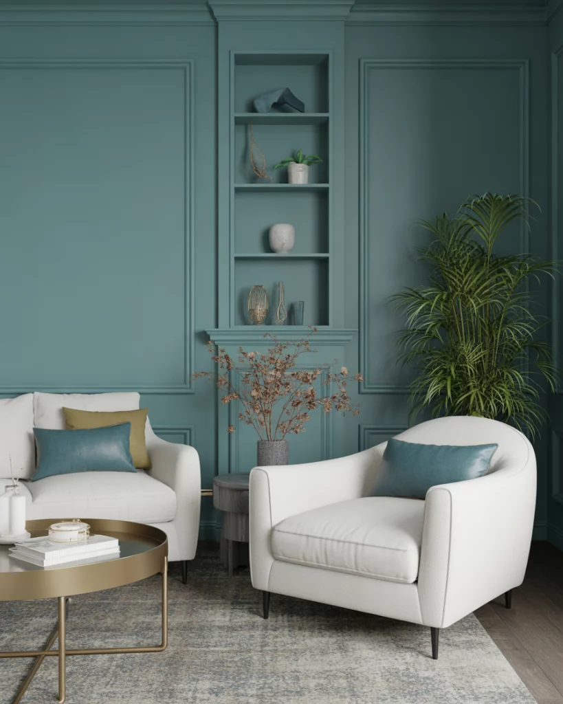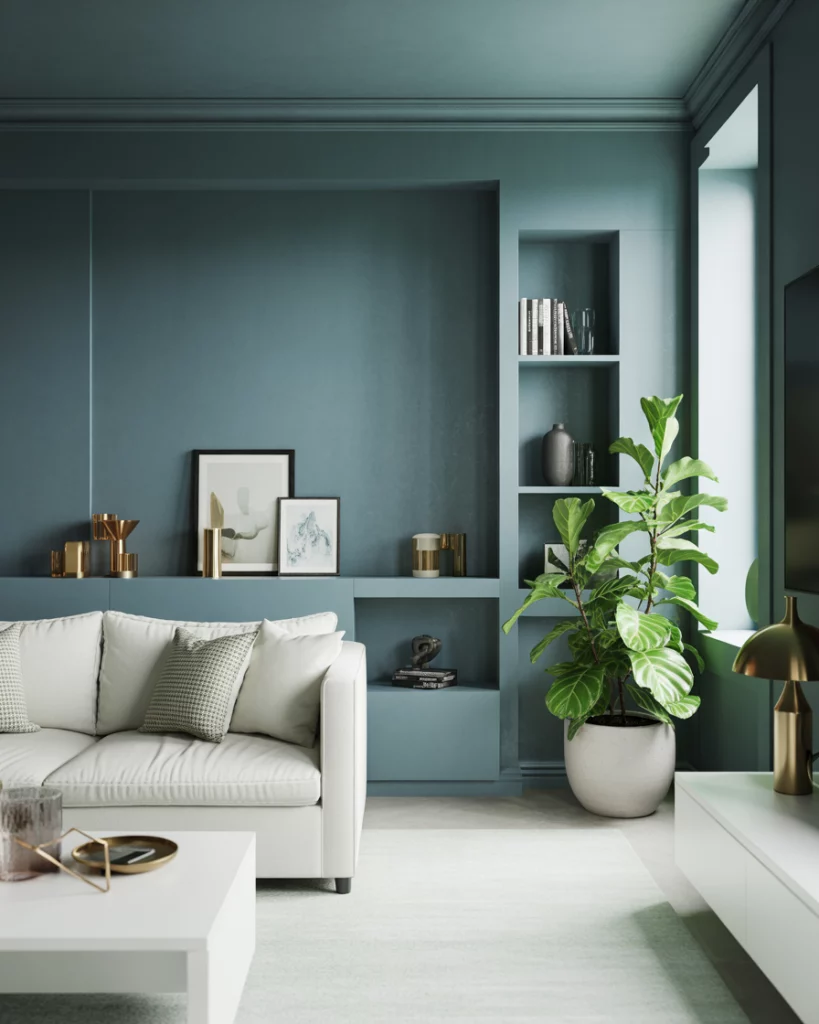 Another décor “trend” could be mixing blues and greens to create a smoky, “muted” color tone, blending both colors, meaning this “muted” or smoky, “jade-blue-green” color tone will now, all by “itself,” create a “neutrality” as a smoky, “muted” color tone, which will allow you to layer whites and metals to lift this room and your décor, providing an opportunity to create interior designs that feel rich, modern, or both, as an example, smoky-blue-green walls, a soft white-upholstered sofa, a “golden” light installation, and a “natural” element, a “large” plant, bringing a “natural” feel to this room.