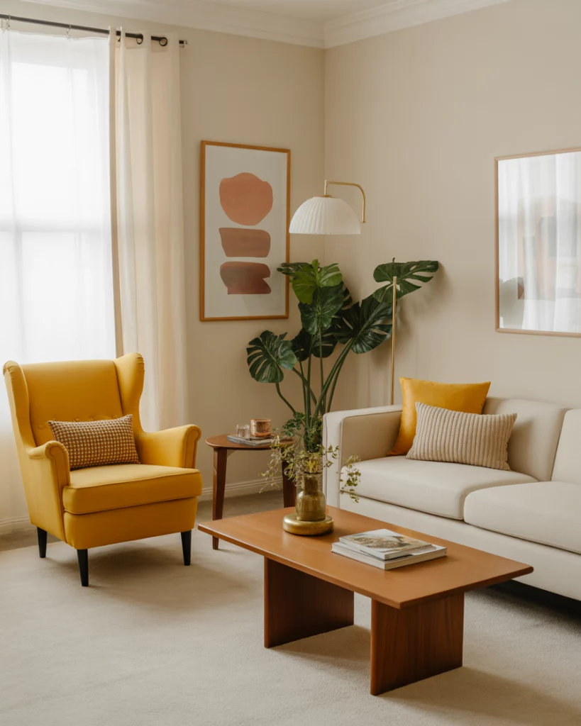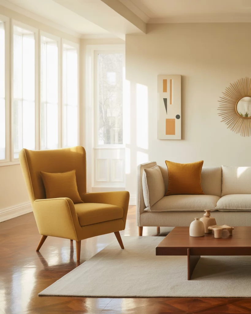 Sometimes the best living rooms are ones that balance energy and calm—enter bright yet tasteful yellow accents against neutral walls. A scheme idea: soft off-white walls, a mustard-yellow armchair, charcoal cushions, and mid-century modern legs. This mixes cheerful color with a relaxed foundation. The palette combines neutral and accent, creating an inviting space that doesn’t shy away from personality. I recently helped a friend pick a yellow accent chair for their living room, and the difference was transformative—the room felt lively but still composed.
