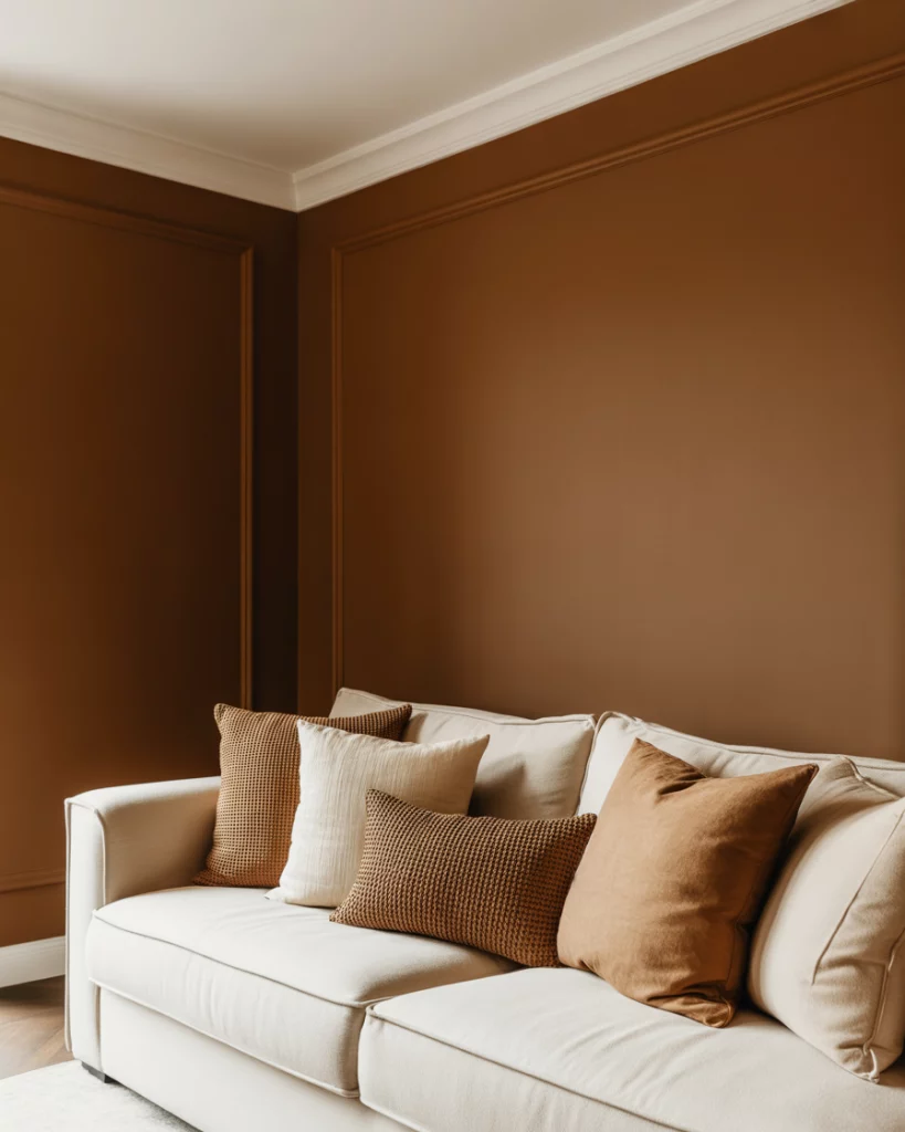 Classic, elegant, and increasingly in style: painting walls in a rich brown tone (think mocha or chocolate) while leaving the combination white wall trim and ceiling to brighten the room. This approach gives the living room an enveloping, intimate feel without making it dark or closed-in. According to trend reports for 2026, darker browns are among the new “neutrals” designers are favoring. A scheme idea: mocha walls, white trim/ceiling, a cream-colored sofa, and textured pillows and throws for added cozy layering.