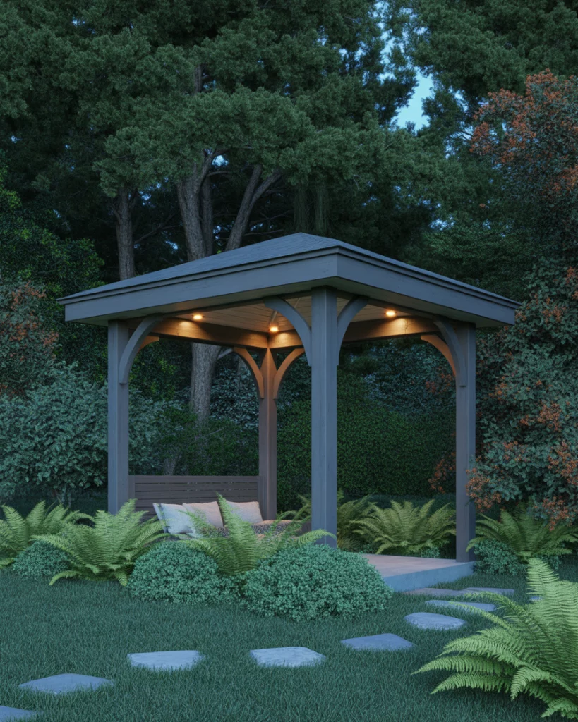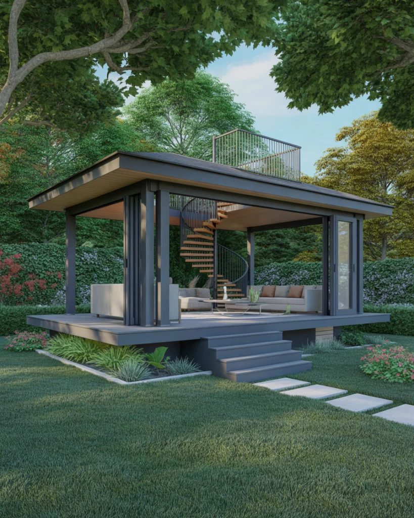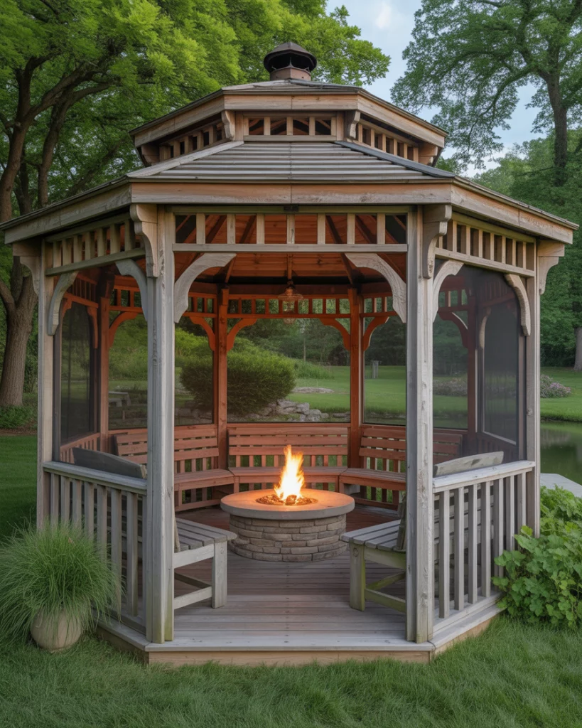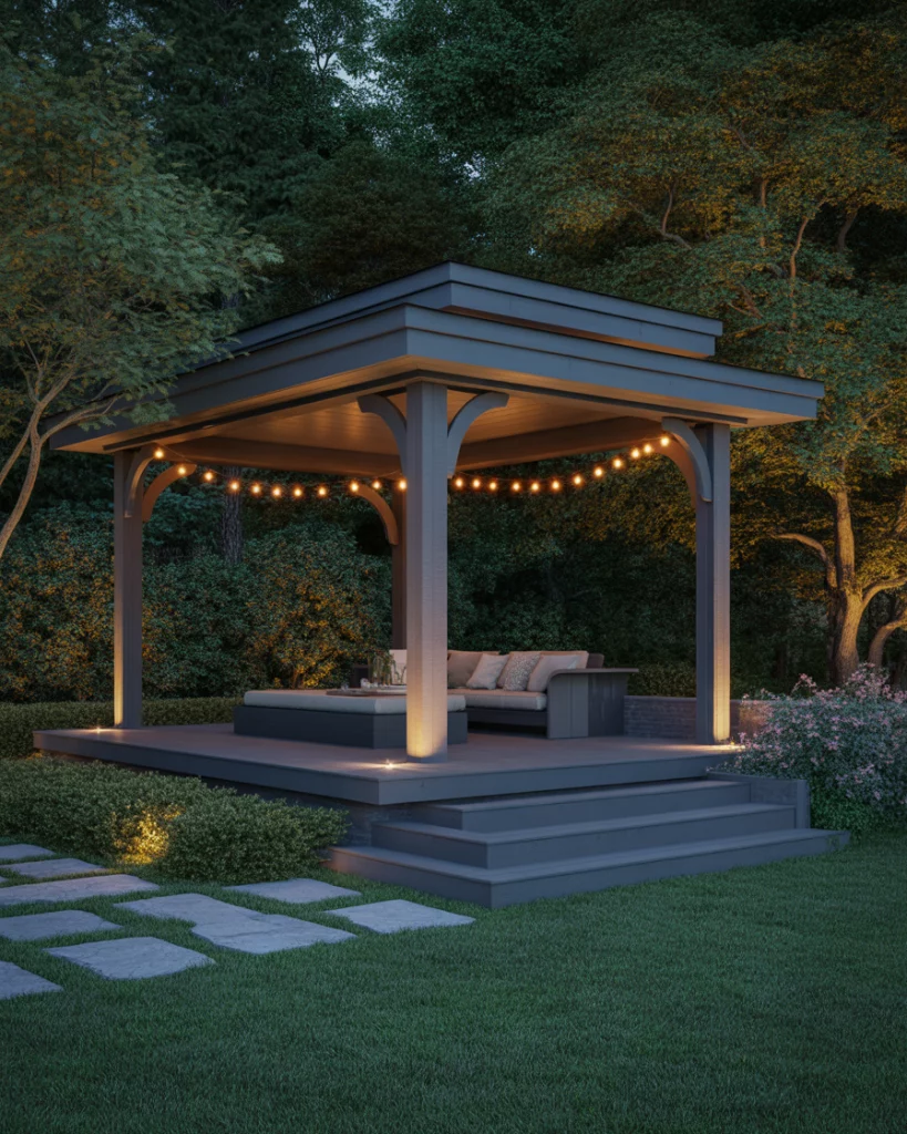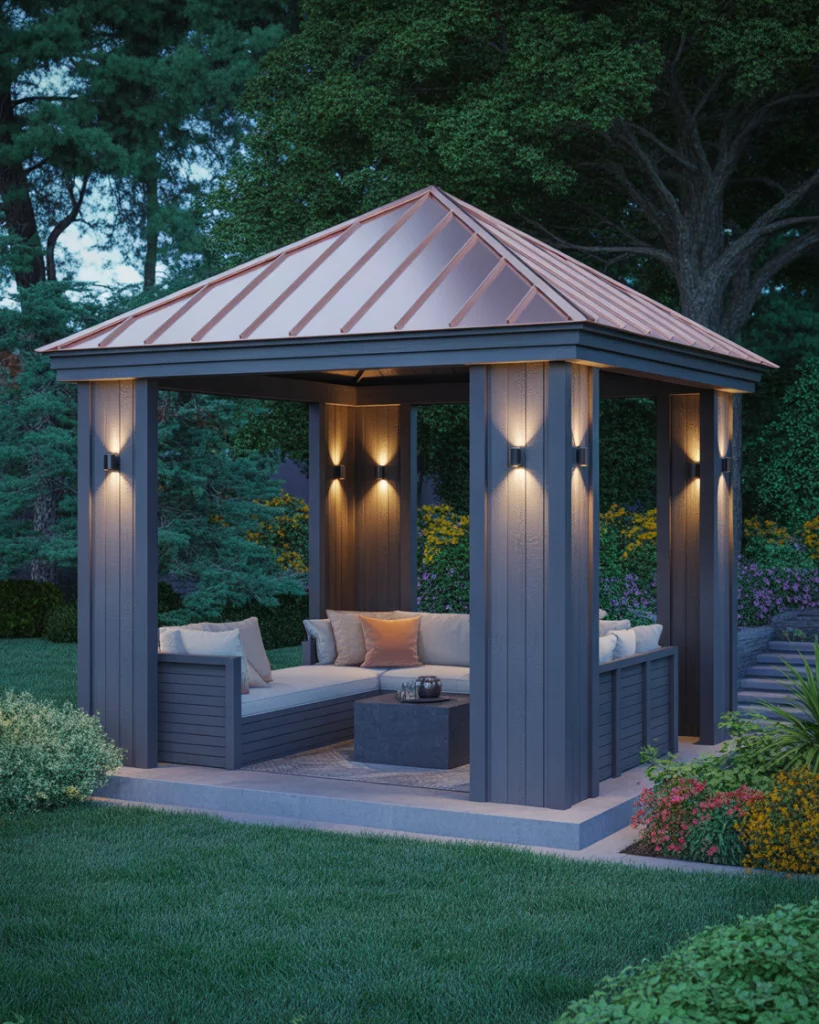 Welcome to the future of outdoor relaxation — a modern smart gazebo equipped with app-controlled lighting, retractable shades, and even motion sensors for climate adjustment. Use glass panels and wood accents for warmth, blending technology with comfort. It’s not a cheap project, but it’s ideal for design lovers who enjoy both innovation and aesthetics. Imagine turning on your fire pit or dimming lights with one tap.