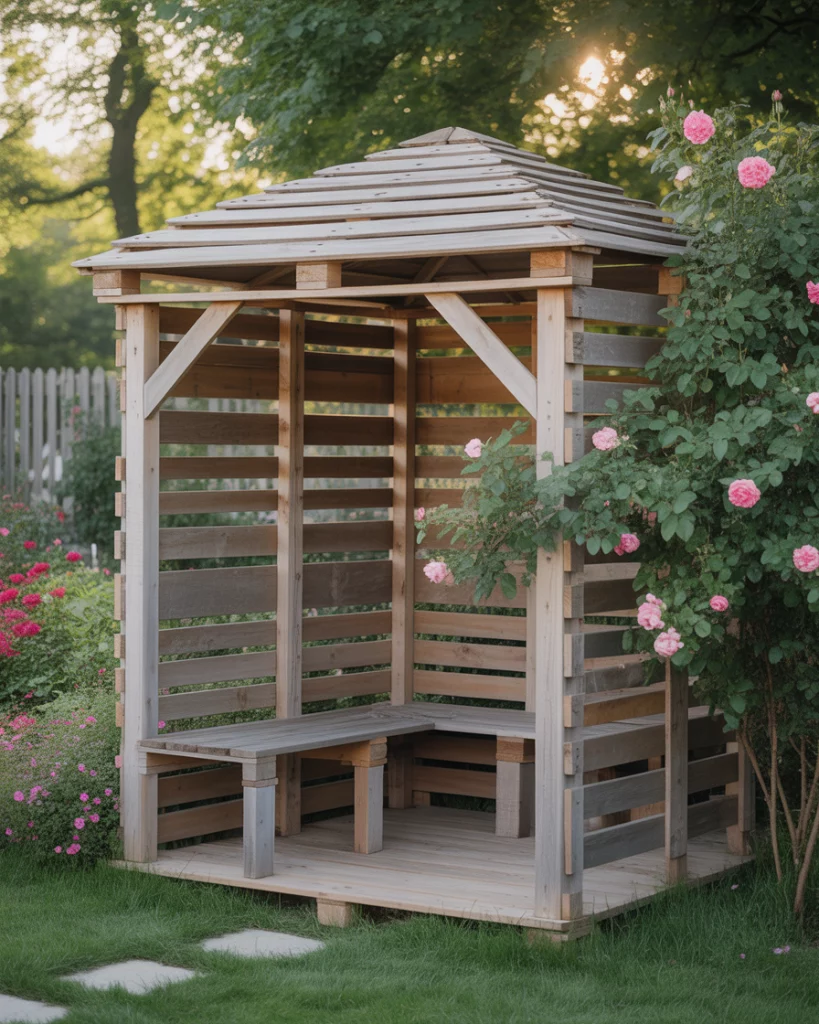 This final idea leans fully into cheap budget and rustic aesthetics by repurposing pallet wood (or reclaimed fence boards). Build a simple covered frame, patch in screened panels where needed, and stain lightly. It’s best for smaller backyards or as a garden focal point. The raw, textured look adds charm, and costs remain low—my cousin built one in a weekend for under a few hundred dollars.
