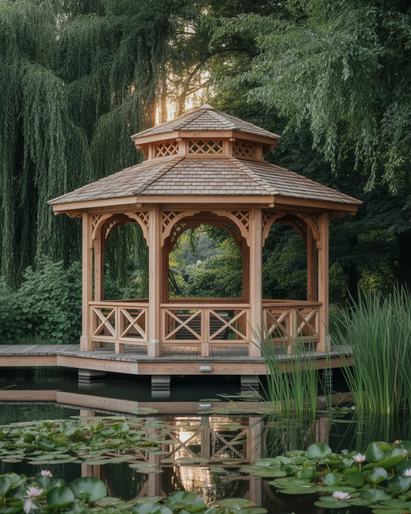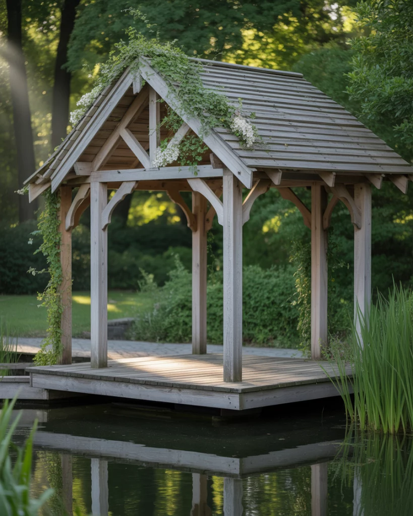 Imagine a wooden deck floating gracefully over a small pond or pool — a covered retreat that feels like an island getaway. Add screened curtains or a light mosquito net for privacy and comfort. This outdoor setup brings calm reflections of water and sky while staying protected. Many homeowners turn this into a weekend DIY project, using pontoons or anchored beams for stability.