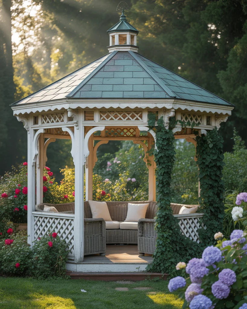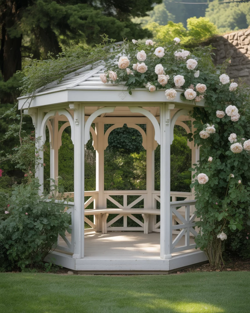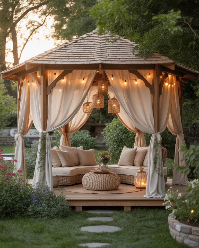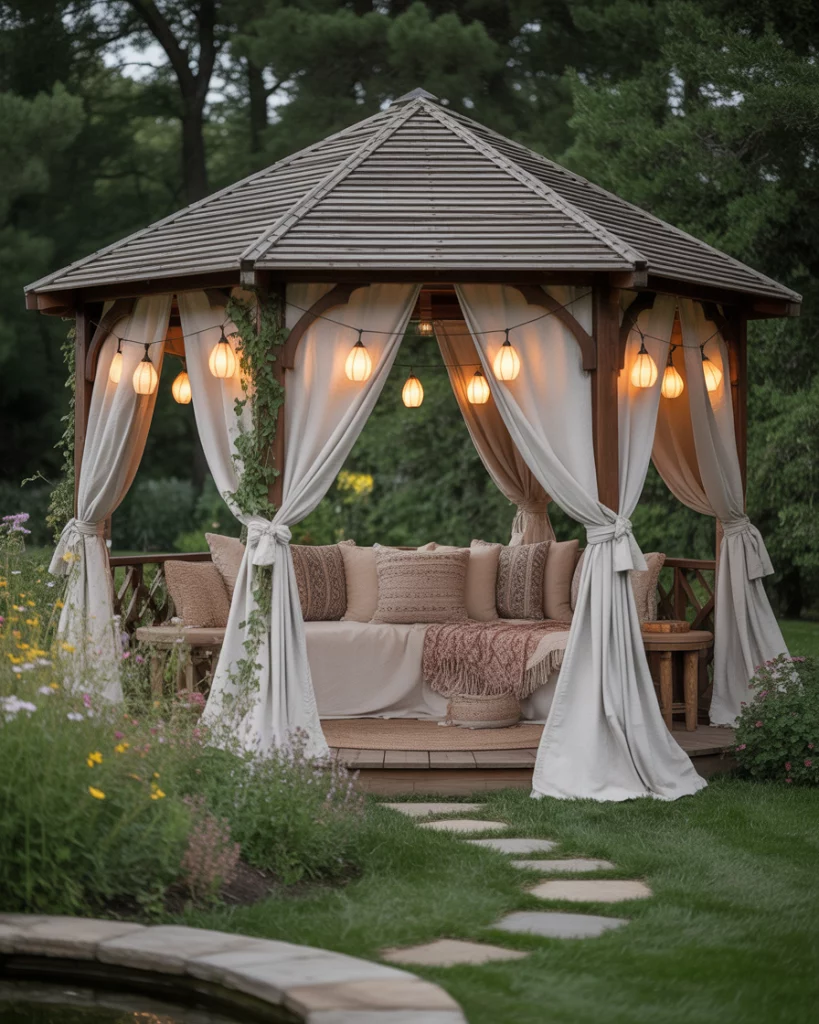 For lovers of classic design, a simple white wooden gazebo surrounded by climbing roses is timeless. It’s elegant, romantic, and fits any landscape. The covered structure provides shade while staying airy and open. Add a small outdoor bench and soft boho pillows for that picture-perfect countryside feel.