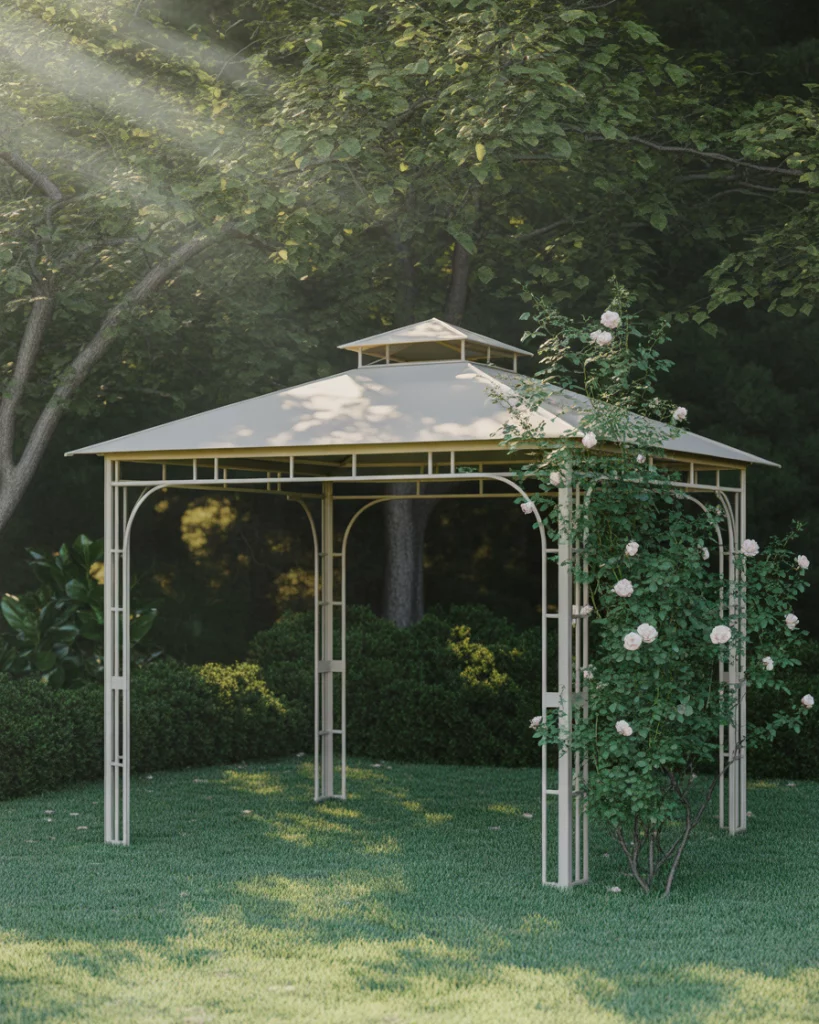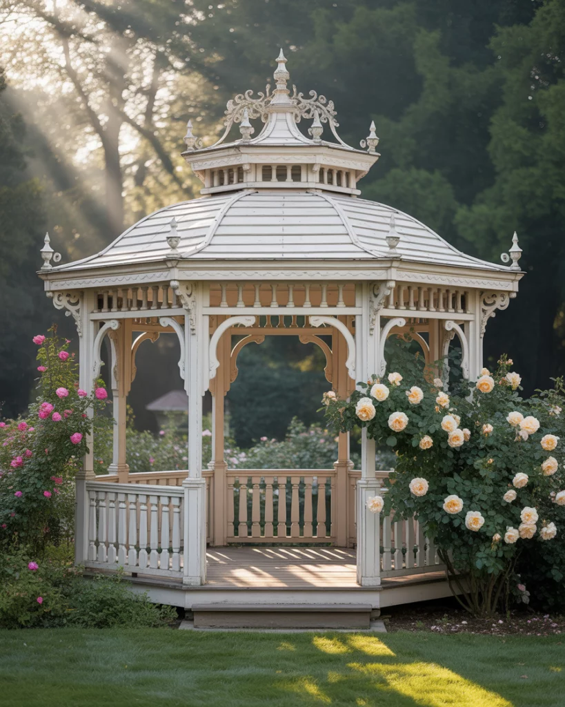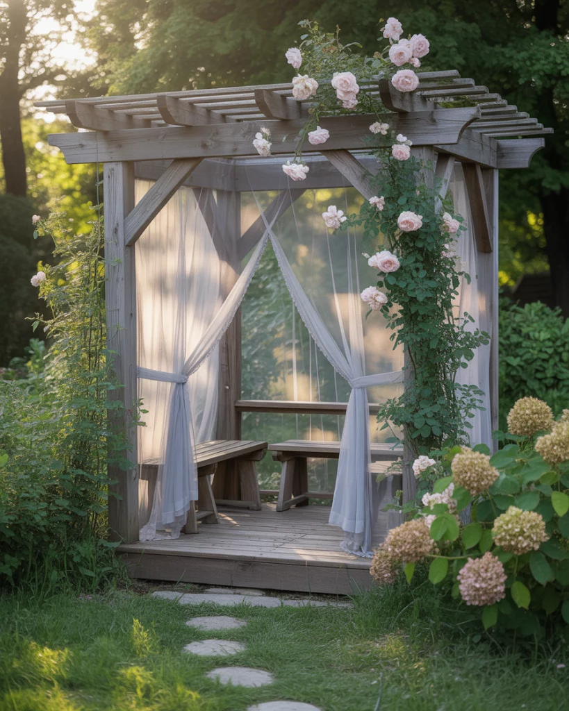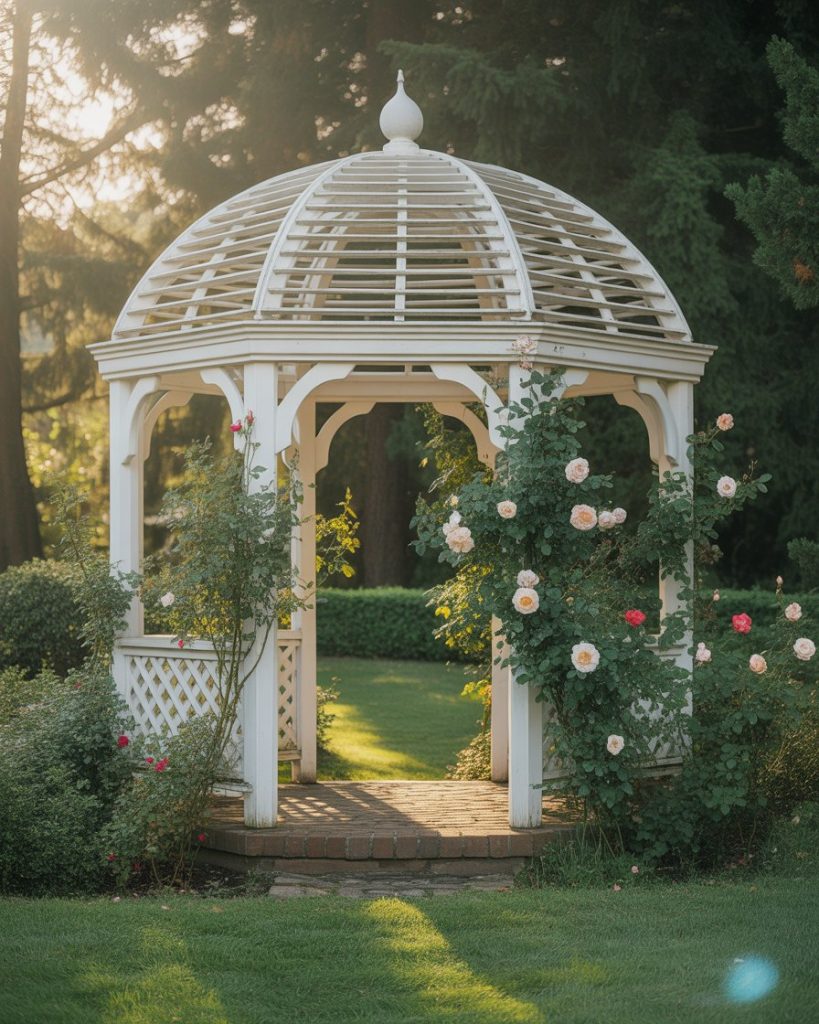 For lovers of classic design, a simple white wooden gazebo surrounded by climbing roses is timeless. It’s elegant, romantic, and fits any landscape. The covered structure provides shade while staying airy and open. Add a small outdoor bench and soft boho pillows for that picture-perfect countryside feel.