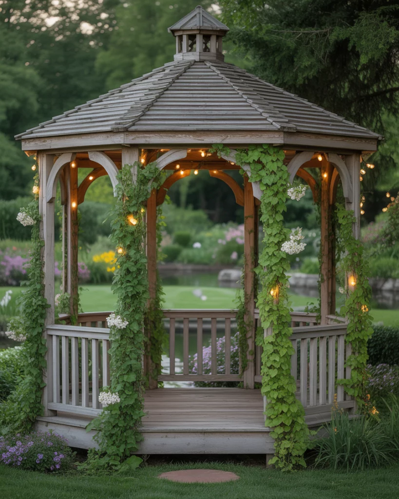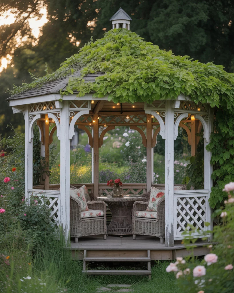 A round gazebo wrapped in climbing ivy or wisteria creates a fairy-tale mood. Soft string lights woven through the beams enhance the cozy evening glow. This style pairs well with rustic decor and wooden benches, blending beautifully into natural landscapes. It’s romantic yet cheap, and easily customizable with seasonal flowers.Prompt: Gazebo ideas backyard round garden gazebo with vines and lights