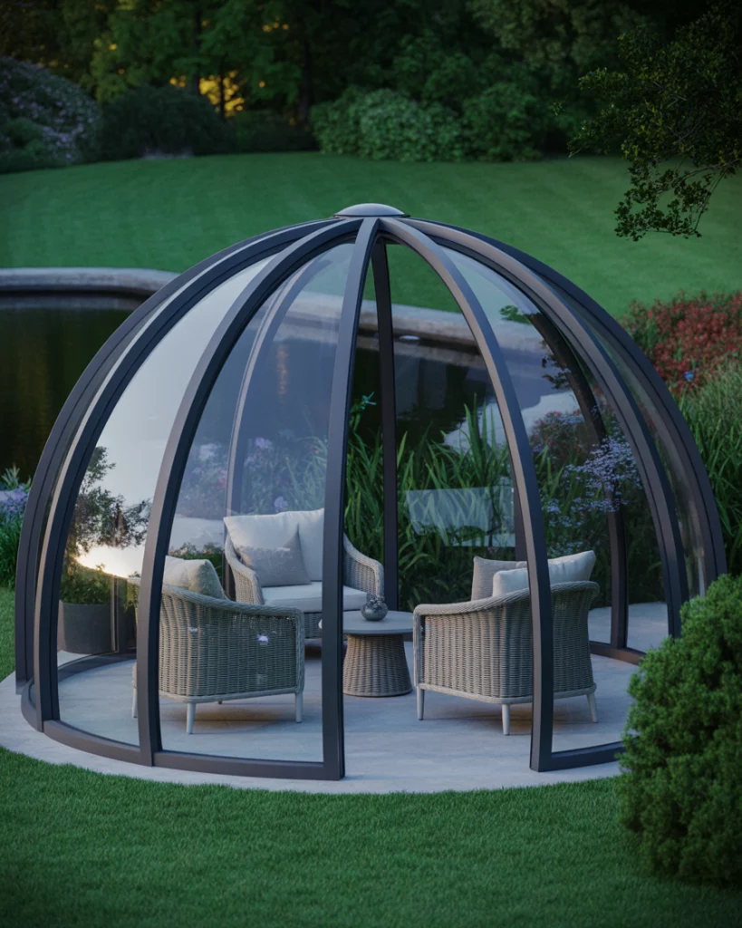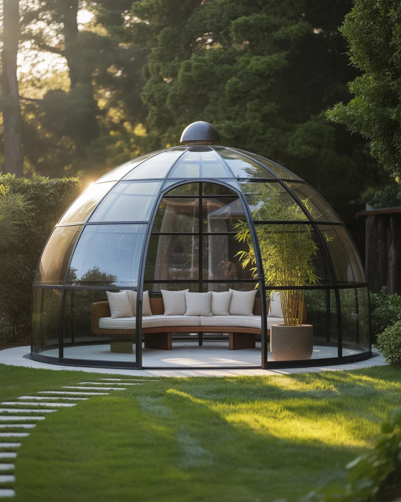 This modern glass dome structure offers panoramic garden views while staying covered and protected from wind. It’s elegant, futuristic, and ideal for cooler climates. Add heating elements or a small fire pit inside to make it usable year-round. Inspired by Scandinavian design, this trend is becoming huge in outdoor decor for 2026.