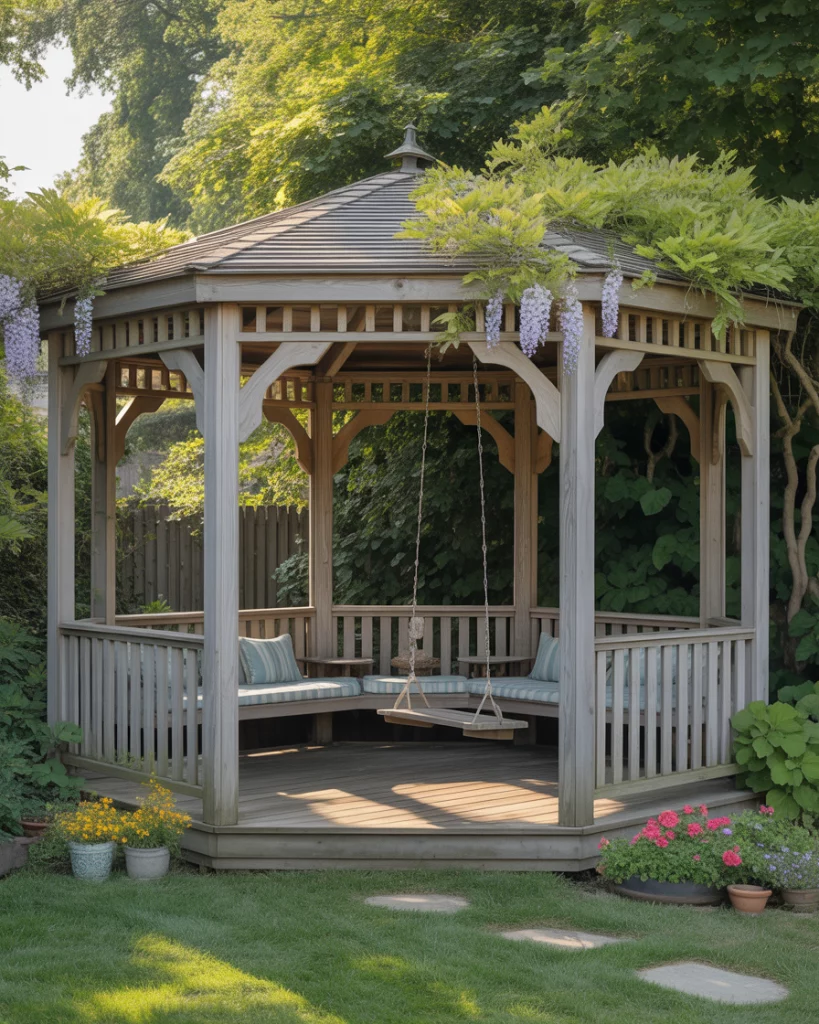 Tuck a corner gazebo into your yard and replace chairs with hanging swings or hammocks. It turns unused space into a relaxing hideaway. Use wooden beams for warmth and a covered roof for shade. The gentle motion of swings gives it a playful, nostalgic vibe — great for both kids and adults.