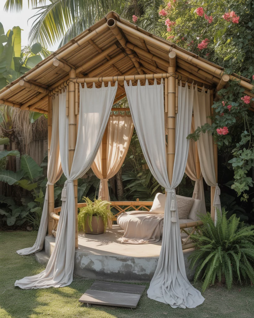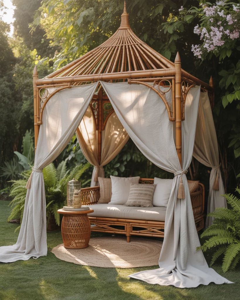 A boho bamboo frame with light covered fabric, colorful cushions, and woven lanterns brings tropical charm. Add a mosquito net for comfort and a rug for warmth. It’s a cheap and creative way to express personality in your outdoor space. I once saw this style at a friend’s beach house — we felt like we were in Bali without leaving the city.