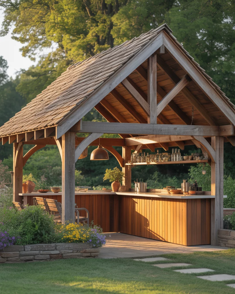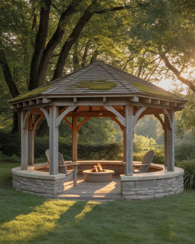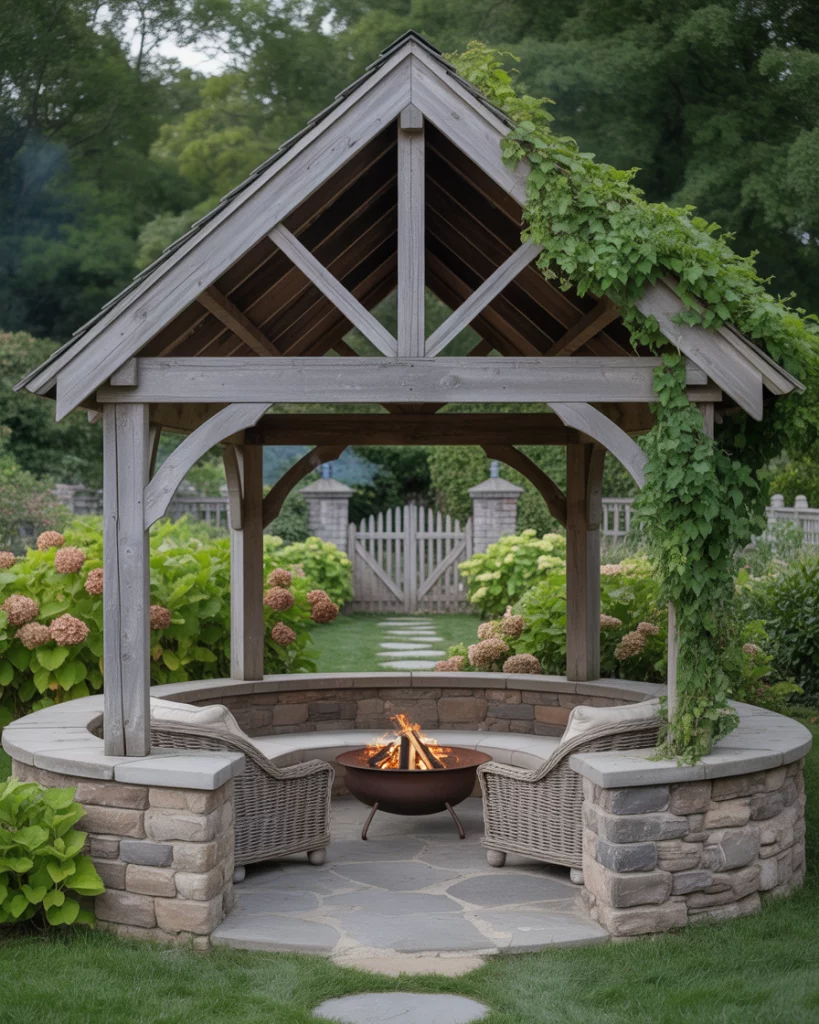 This rustic design combines natural wood beams with a stone foundation and built-in fire pit. It’s sturdy, warm, and perfect for mountain or forest settings. Add covered roofing and simple string lighting for an inviting evening vibe. It’s a timeless piece that makes guests linger long after sunset.