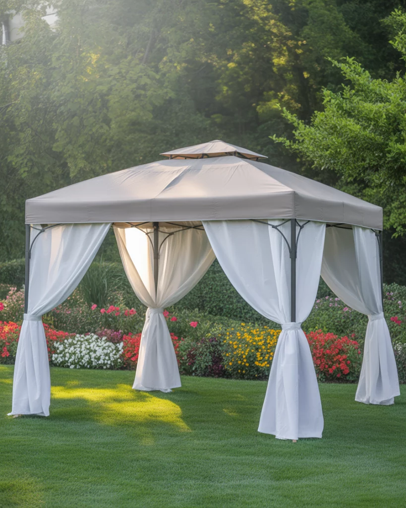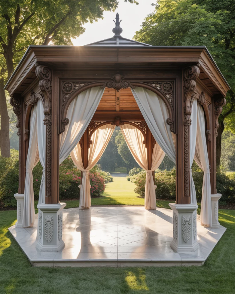 A large gazebo can double as an outdoor venue for birthdays or weddings. With a covered roof, glass panels, or flowing drapes, it provides a festive yet functional setting. Add twinkling lights, portable bar, and modern decor touches. My sister hosted her engagement party in one — and it became the star of the evening.