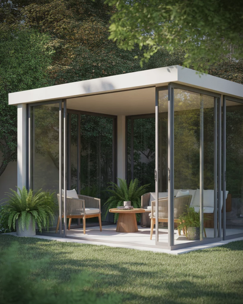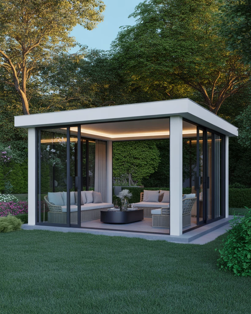 Think about a sleek white frame gazebo with full-height glass walls. Its transparent walls blur the divide between inside and outside. The structure basks in daylight but also blesses you with shelter from the wind and bugs, ideal for those cooler evenings or shoulder seasons. The transparent enclosure leaves little space for the outdoor area to breathe, though it is extremely good protection. Try for a cheap budget alternative using modular glass panels that are easier to DIY with.