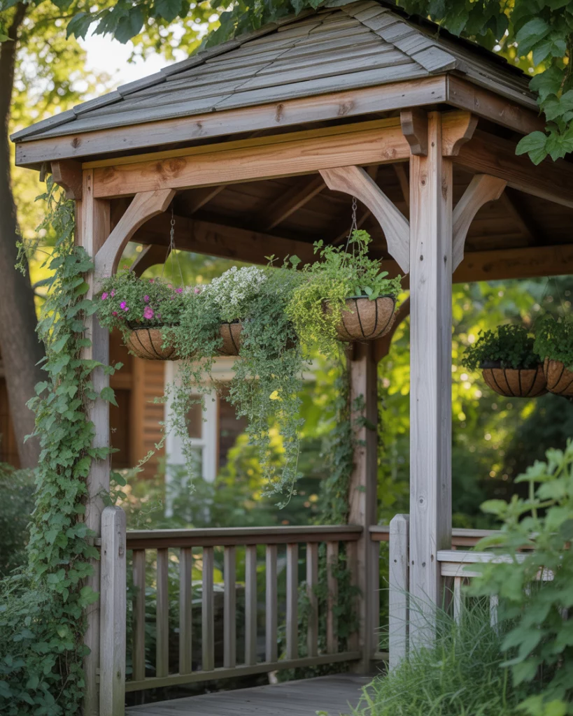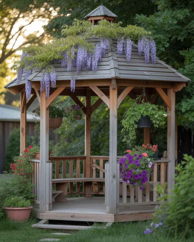 This DIY project transforms a wooden frame gazebo into a mini paradise with hanging planters, vines, and even edible herbs. It’s cheap budget, eco-friendly, and doubles as decor. The scent of basil, lavender, or mint floating in the breeze adds a sensory charm to your outdoor evenings. A friend told me their kids now call it the “garden fort.