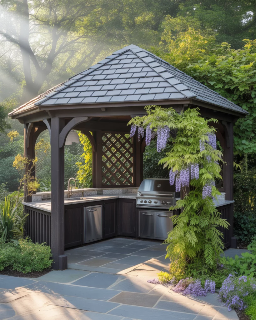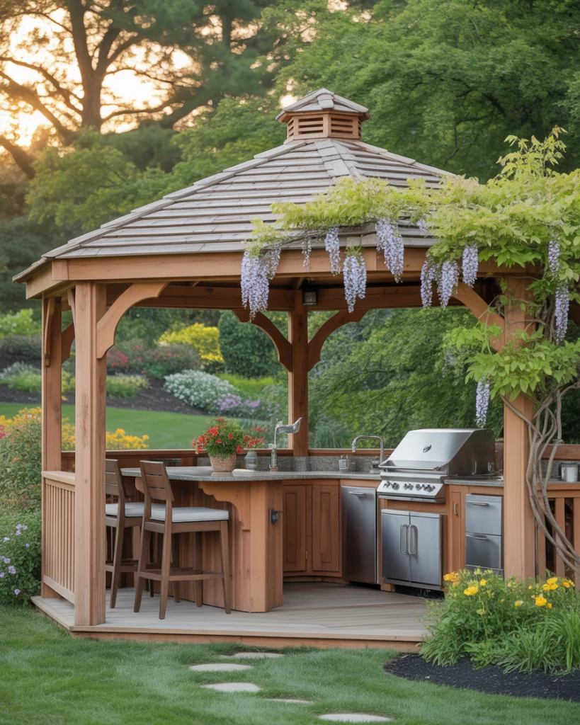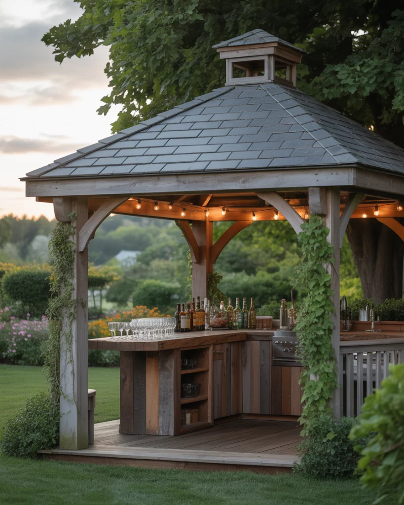 For food lovers, this outdoor kitchen gazebo turns your yard into a summer dining destination. Build a covered structure with a rustic wood counter, small fridge, and stools. Add a fire pit or grill for that perfect barbecue vibe. Even with a cheap budget, you can achieve a cozy, social atmosphere where cooking and entertaining blend seamlessly.