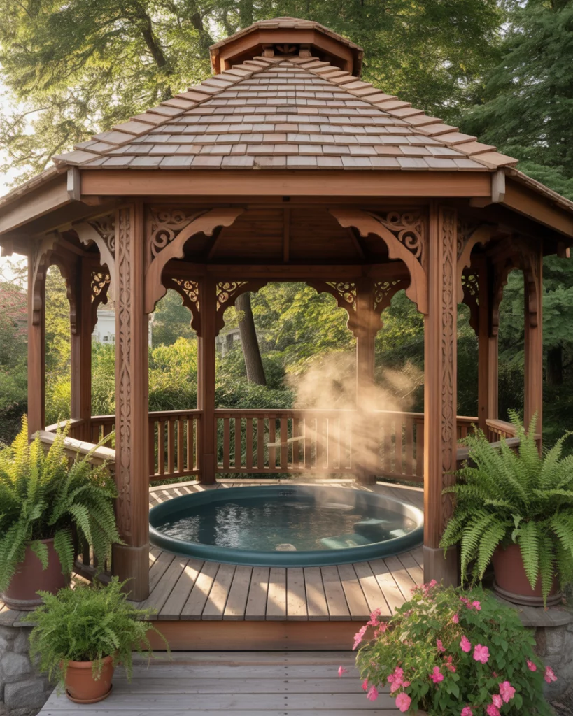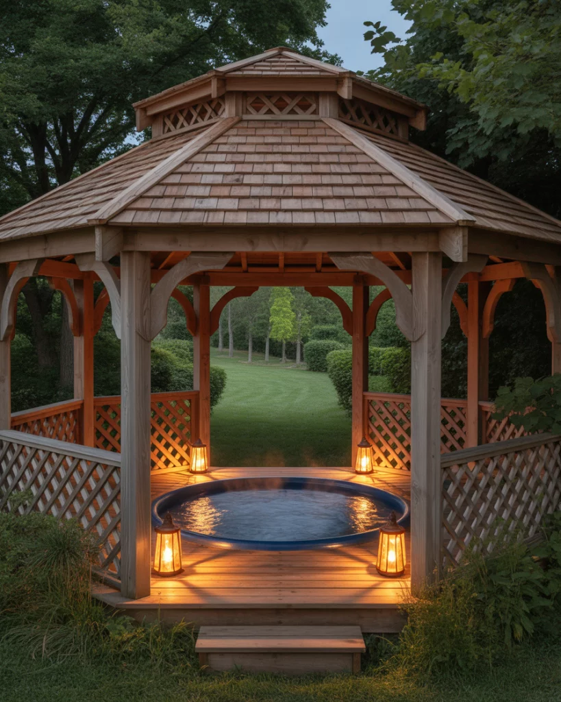 Think of a covered gazebo around a hot tub. The structure would provide shelter and privacy, protecting it from leaves or insects. Use latchable screened panels or sliding glass walls to enclose when needed. In my friend’s suburban home, this hot tub gazebo became their favorite winter retreat.