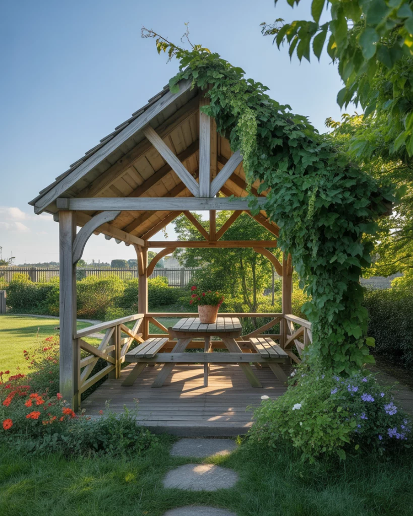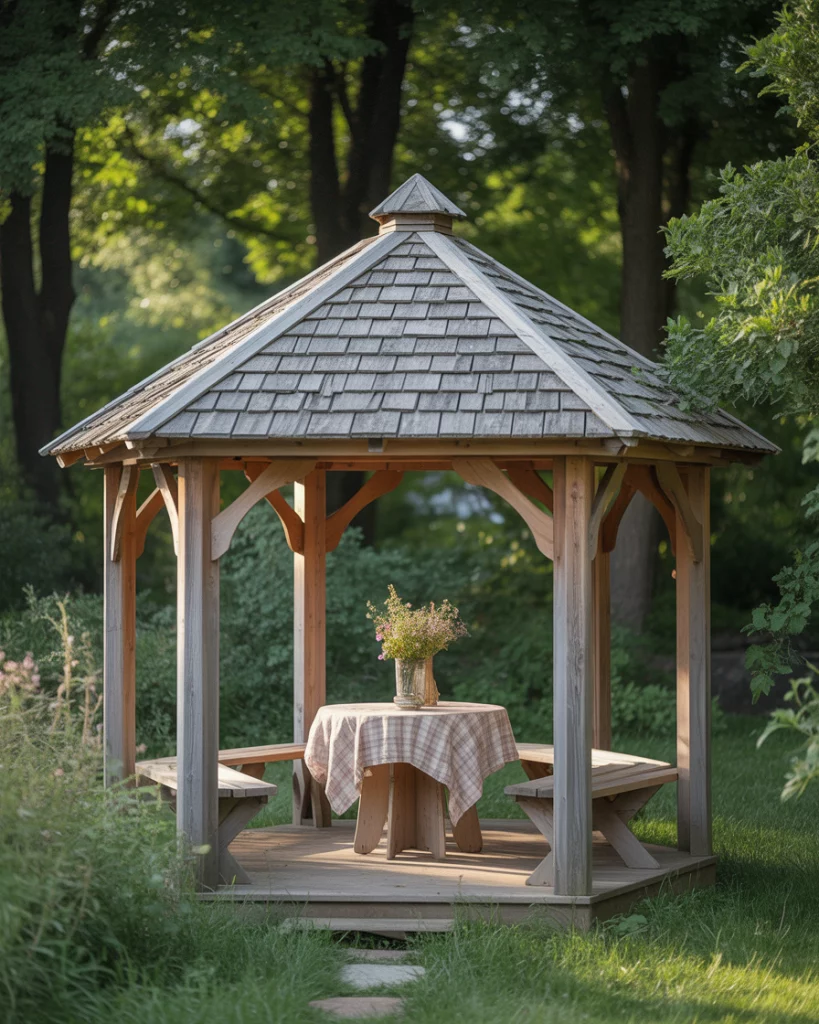 A no-frills wooden gazebo with basic roof, maybe open or semi-screened, set over a picnic table or outdoor dining set, is simple and effective. It’s great for yards where you just want shade and shelter for meals or games. This is among the more cheap budget ideas if you DIY with standard lumber. Add climbing vines to soften edges.
