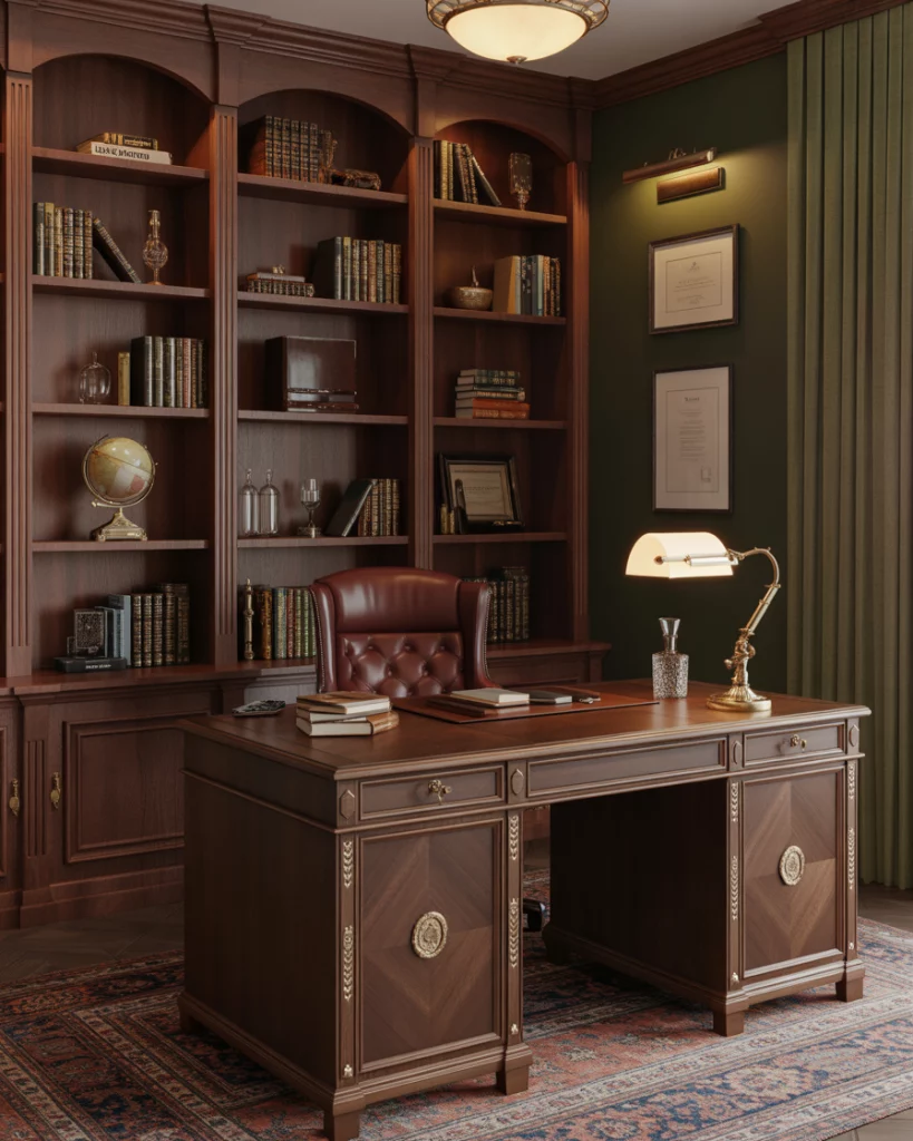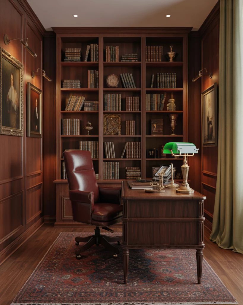 A classic home office never goes out of style. Rich woods, elegant paneling, and leather textures create a sophisticated environment that evokes traditional study rooms. Add modern lighting and tech integration for a 2026 twist. This interior is ideal for men or anyone who values heritage design and luxury craftsmanship. The look channels Ralph Lauren’s timeless aesthetic while staying functional.