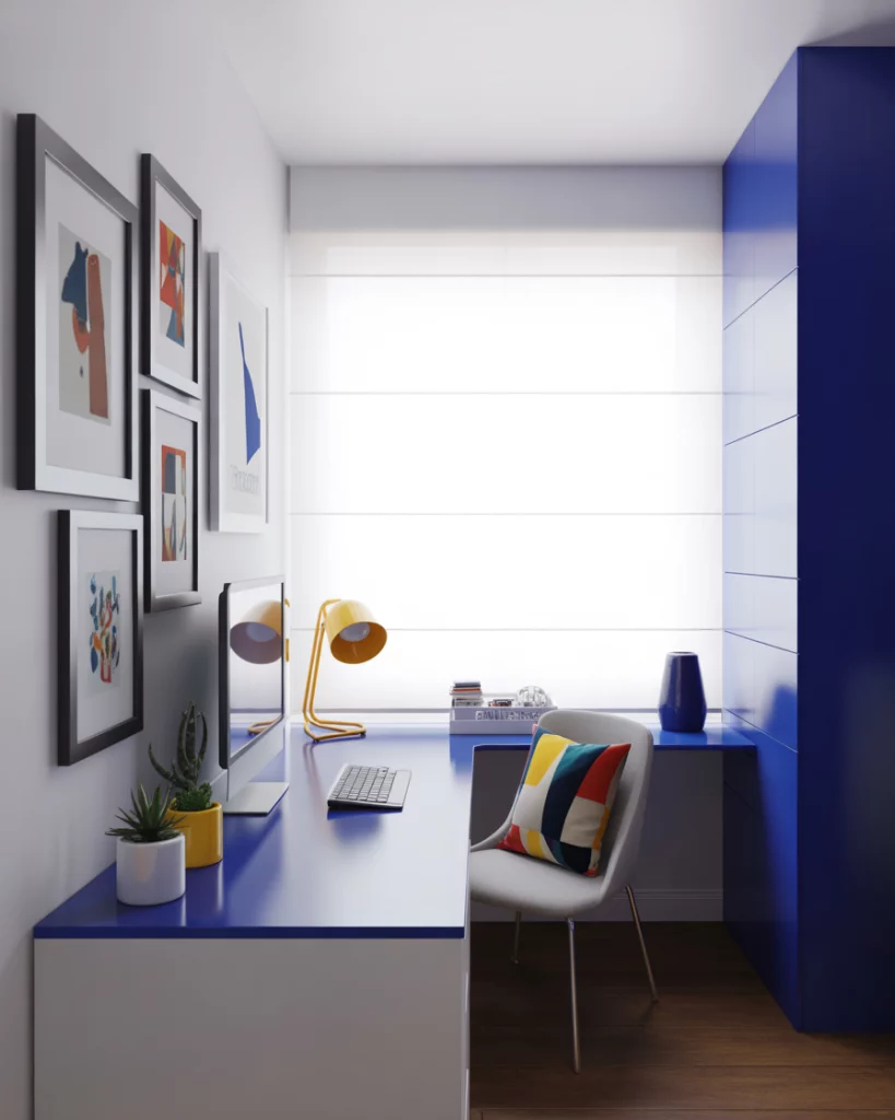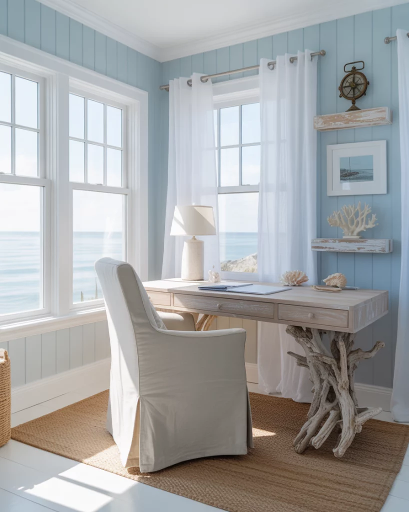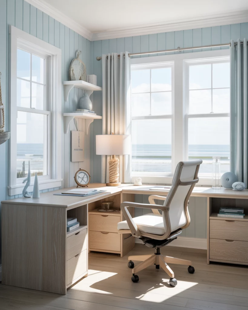 The blue color trend continues strong in 2026—soft sea tones bring serenity to your workspace. Combine whitewashed wood, linen curtains, and ocean-inspired accents for a cool, breezy vibe. This design works well in small spaces or near windows with natural light. Coastal inspiration from interior stylists like Emily Henderson makes it feel fresh yet grounded.
