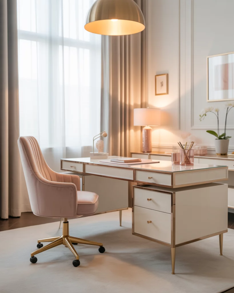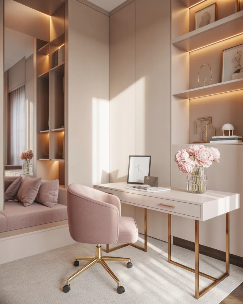 Home offices for women in 2026 emphasize soft tones, tactile comfort, and elegance. Think blush accents, rounded forms, and gold detailing that feel like modern luxury without being fussy. The interior blends functionality and beauty, reflecting calm productivity. Designers like Shea McGee have popularized this feminine-meets-functional approach.