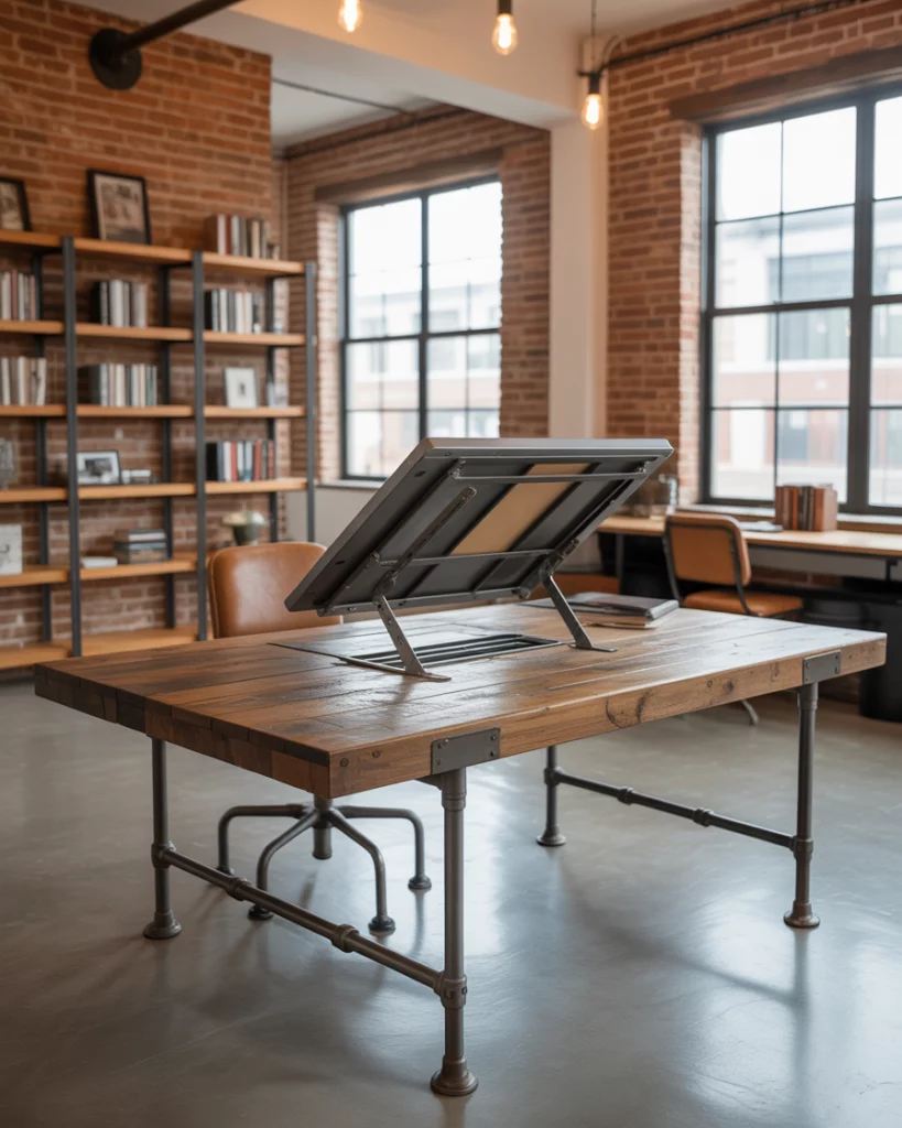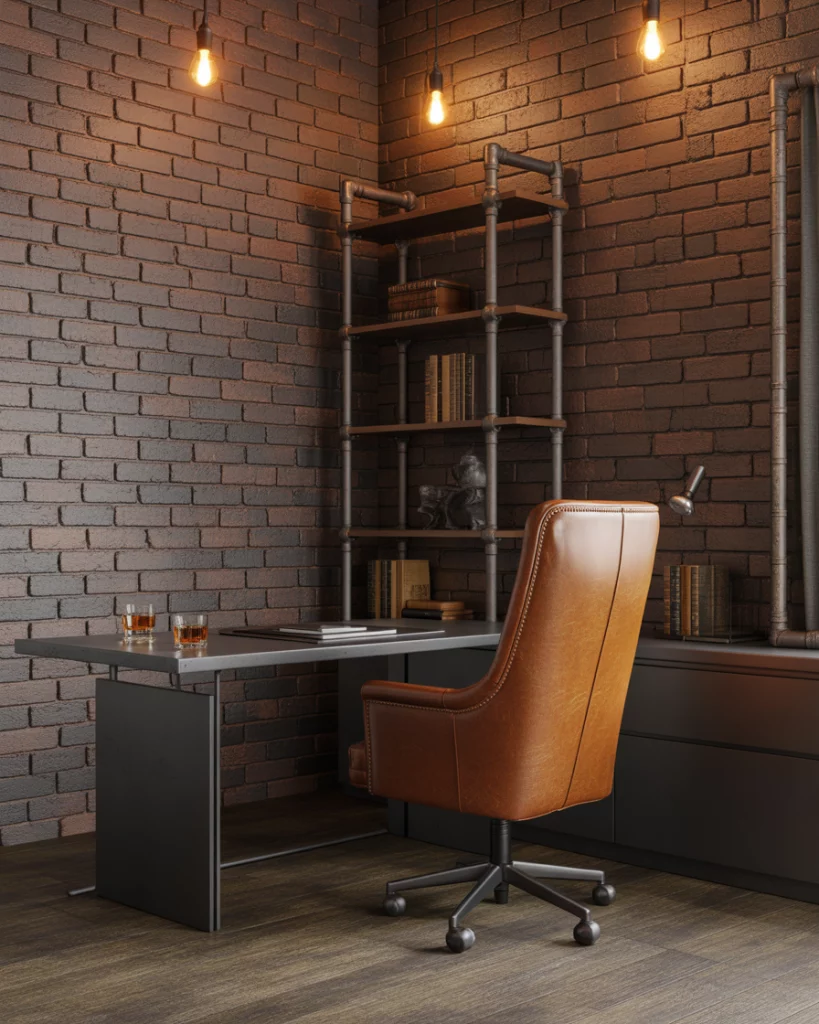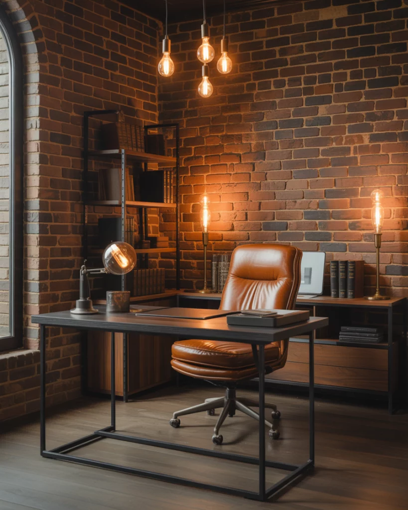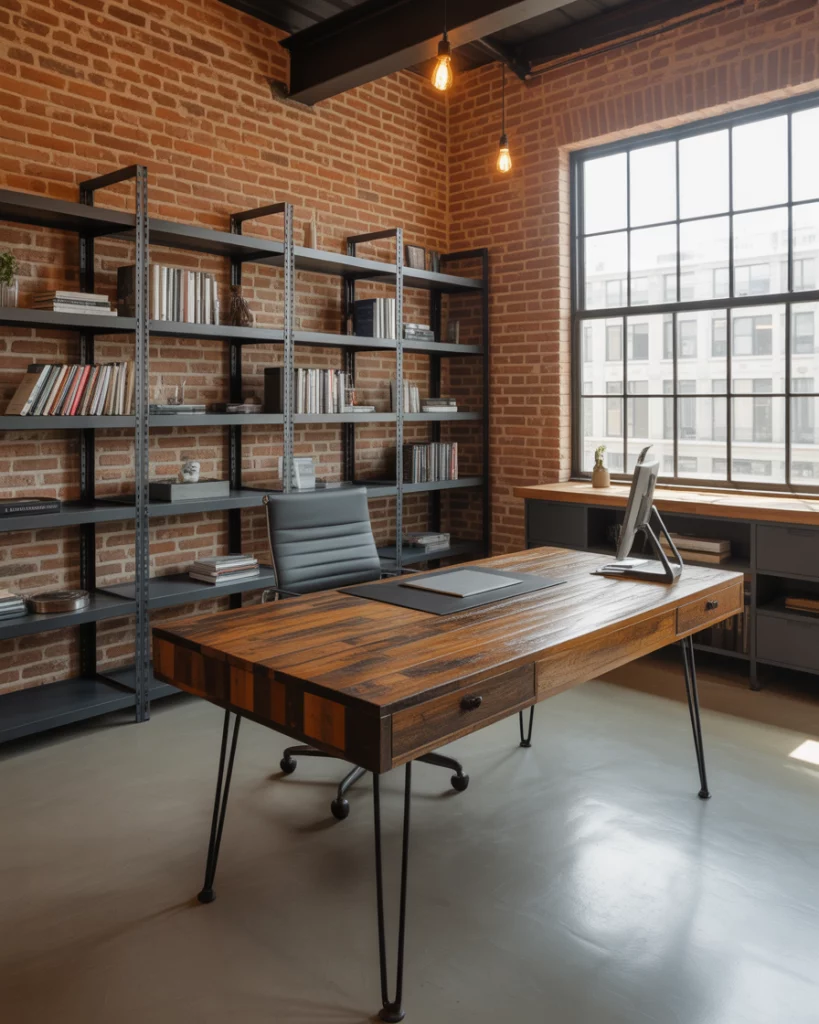 For lovers of industrial character, expose brick walls, steel pipe shelving, and reclaimed wood desks. Combine that with a sleek standing desk and minimal modern lighting to keep it grounded and functional. This style fits best in lofts or rooms with high ceilings but can also be adapted in open apartment layouts. Influences from industrial revival architects like Thomas Heatherwick or Brooklyn loft conversions will lend authenticity.