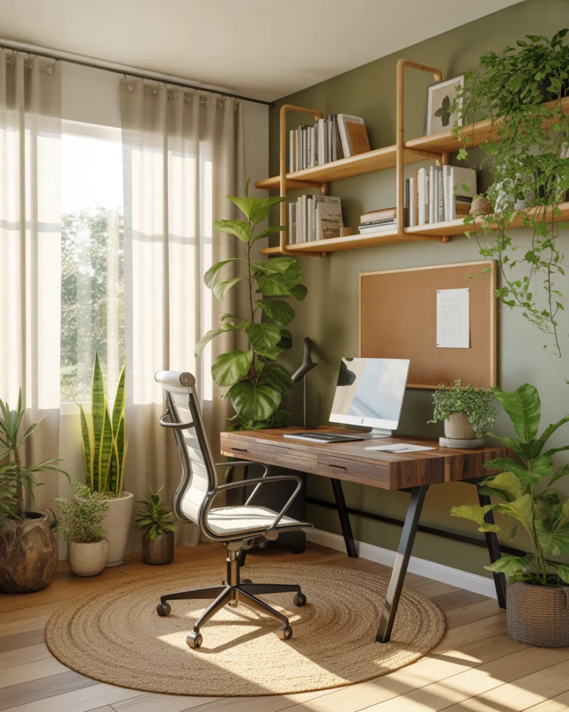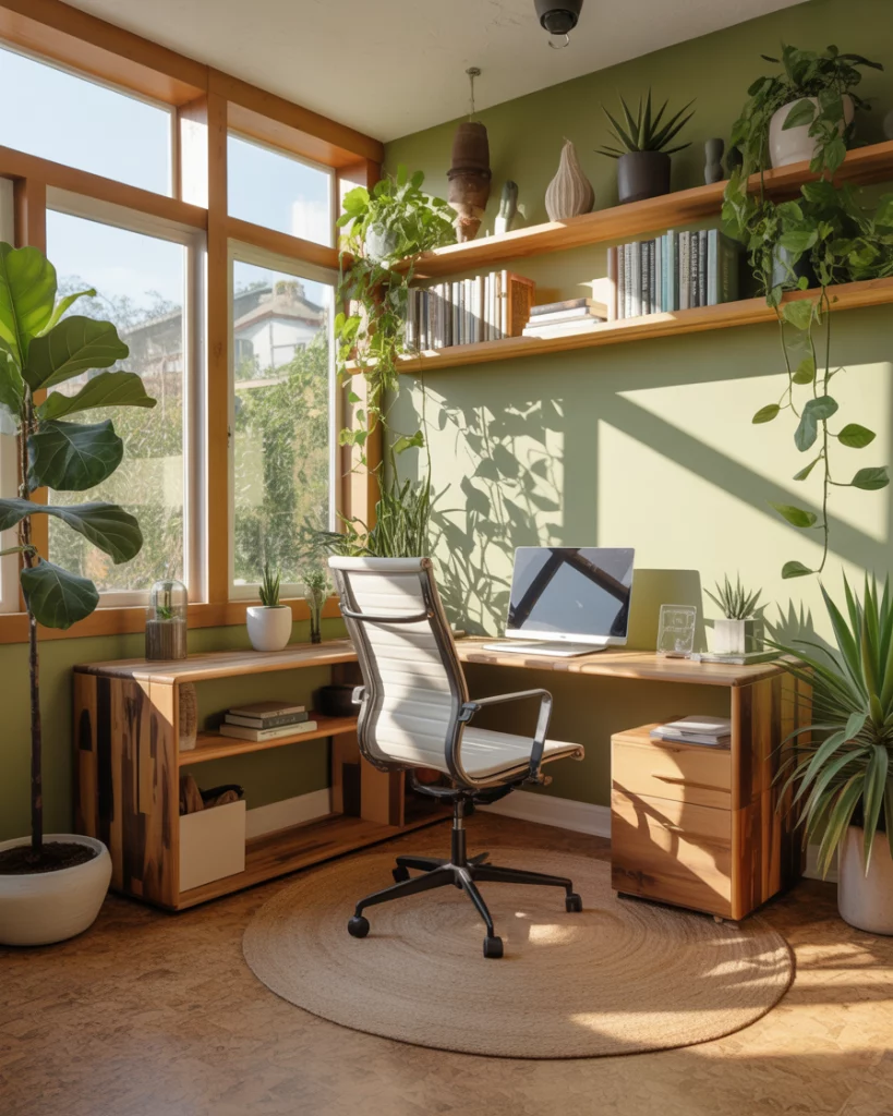 Sustainability drives modern interior design trends in 2026. Create an eco-conscious workspace with recycled wood, non-toxic paints, energy-efficient lighting, and plenty of greenery. Adding plants keeps the air fresh and makes the room feel cozy and alive. Influencers like Justina Blakeney continue to inspire eco-focused decor that blends ethics with beauty.
