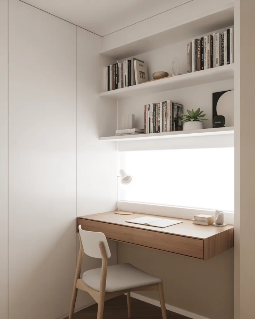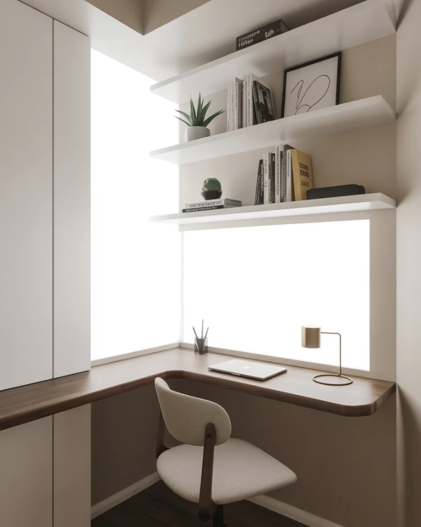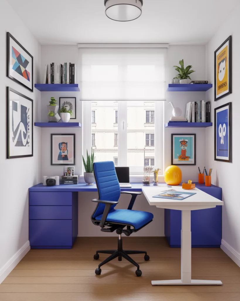 When space is limited, a minimal corner setup can still be stylish. Install floating shelves, a slim wall-mounted desk, and clever lighting. Add personal touches like artwork or a fun lamp for charm. This small space solution is ideal for apartments and micro homes, showing that creativity thrives in compact setups.