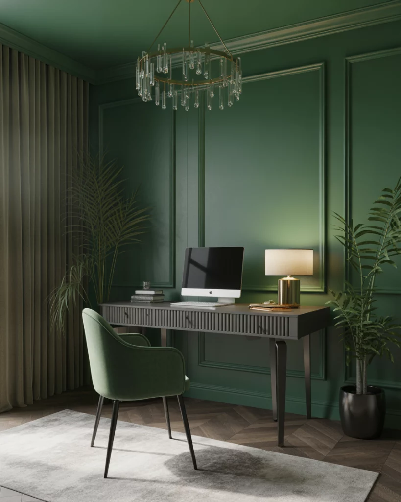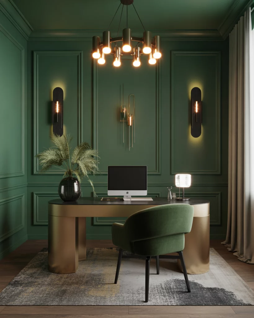 Combining moody tones with modern luxury creates a glamorous yet focused environment. Dark emerald walls, gold hardware, and soft velvet chairs elevate the space. This approach suits creative professionals who want drama without distraction. Designers like Kelly Hoppen emphasize contrast and texture for balance.
