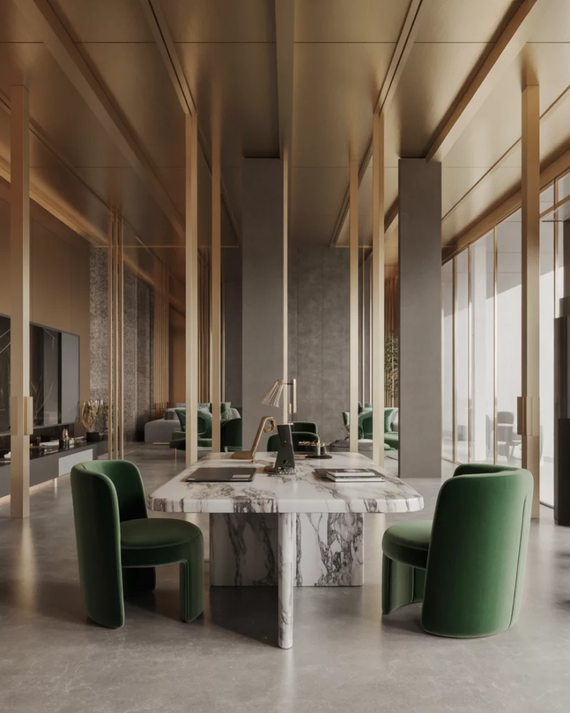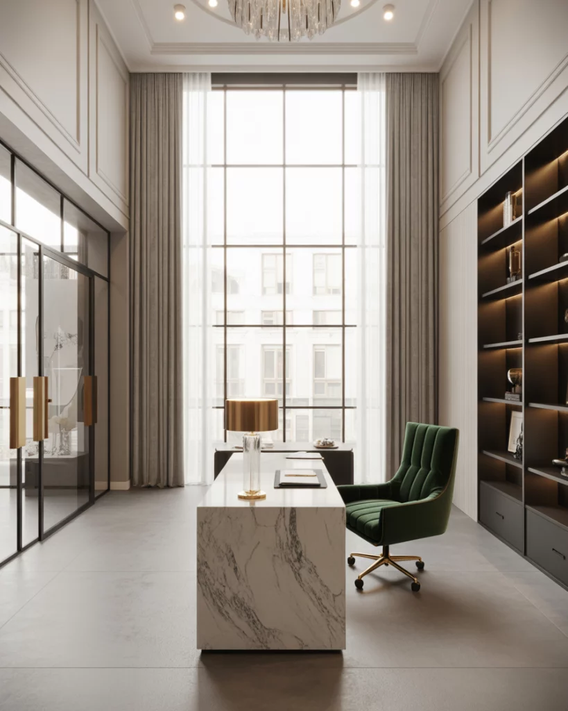 If you yearn to create a modern luxury in your office zone, overlap rich textures such as velvet, marble, and brushed metal with matte woods. Consider a velvet task chair, a marble-top office desk, and a statement light in a contemporary format. This design holds up in a spacious bedroom or open space where the luxury gets space to have its say. Interior gurus like Kelly Wearstler and Nate Berkus often combine contrast and opulence—a technique worth borrowing in 2026.