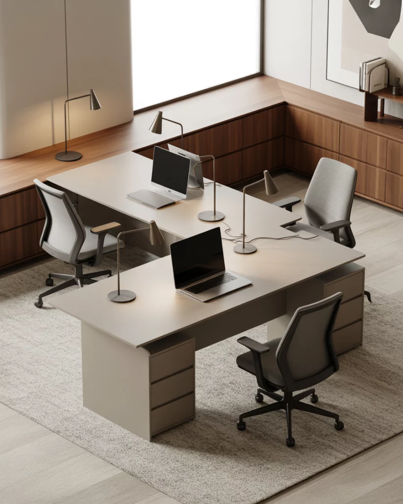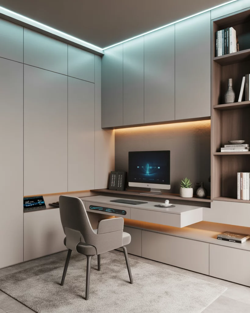 In 2026, modern offices are fully connected ecosystems. Wireless charging pads, voice-controlled lighting, and smart temperature systems make your workspace both sleek and efficient. The design stays minimal, blending tech seamlessly into the interior without visual clutter. This setup fits perfectly for those who love gadgets but want a calm, professional atmosphere.