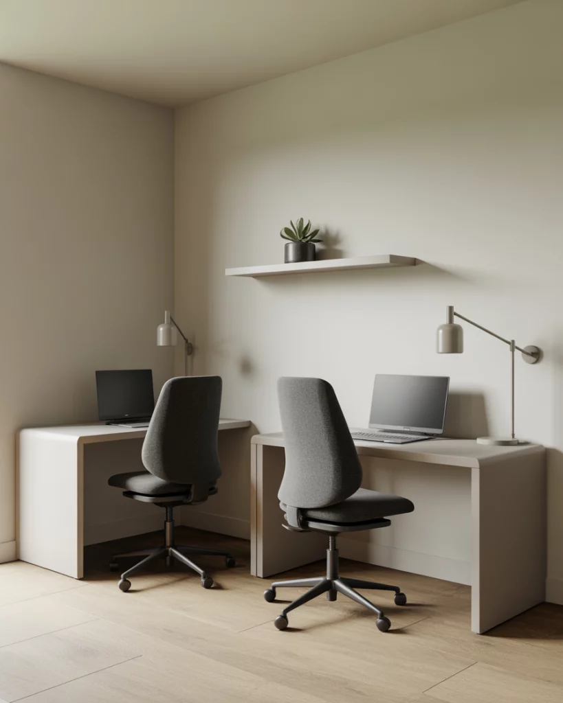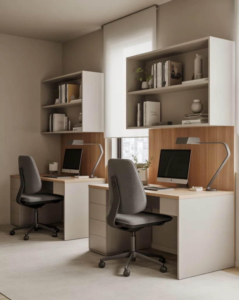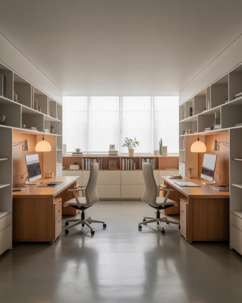 Designing a home office for two demands zoning and smart furniture. Use dual desks, a shared credenza, or a bench seating layout to maintain collaboration while preserving individual territories. You can combine modern or fun accents to distinguish each side. This is ideal in a larger bedroom or open loft. Many architects creating work-from-home homes now speak to this dual requirement for couples or partners.