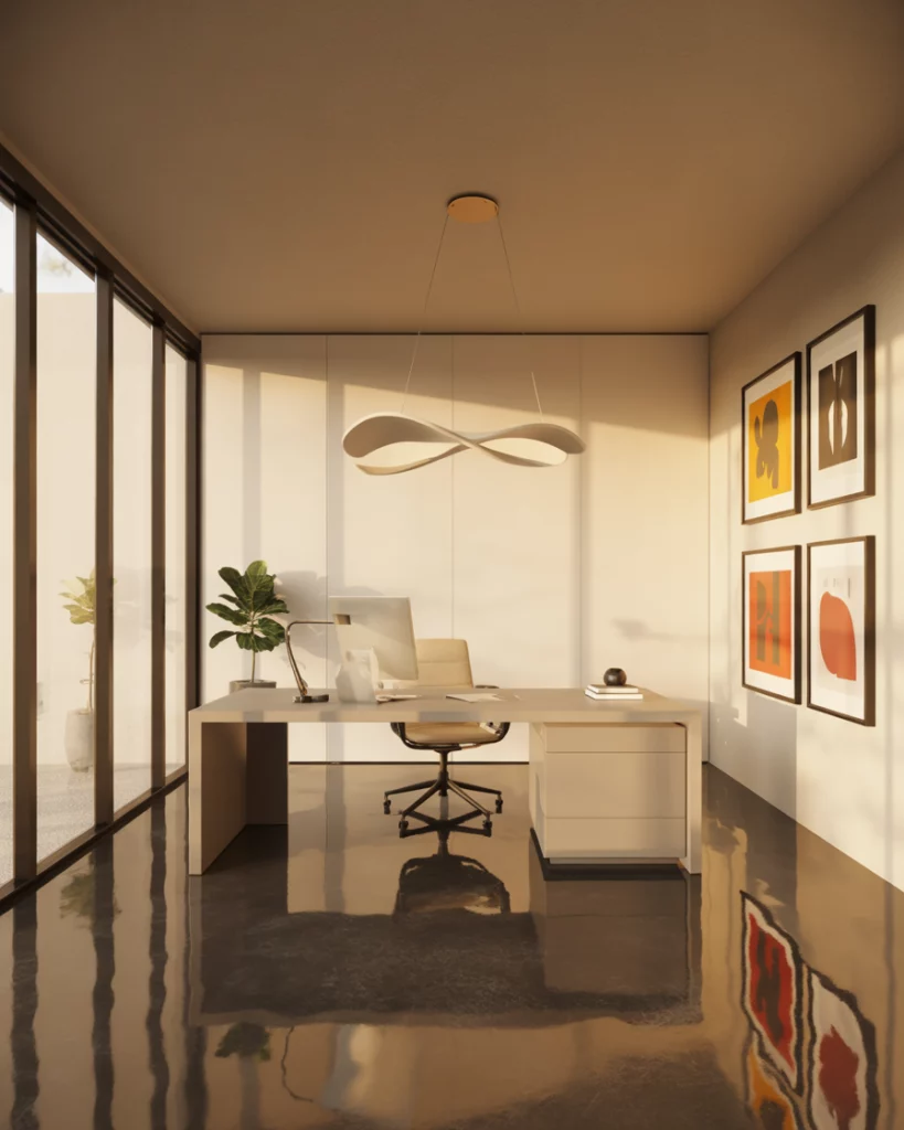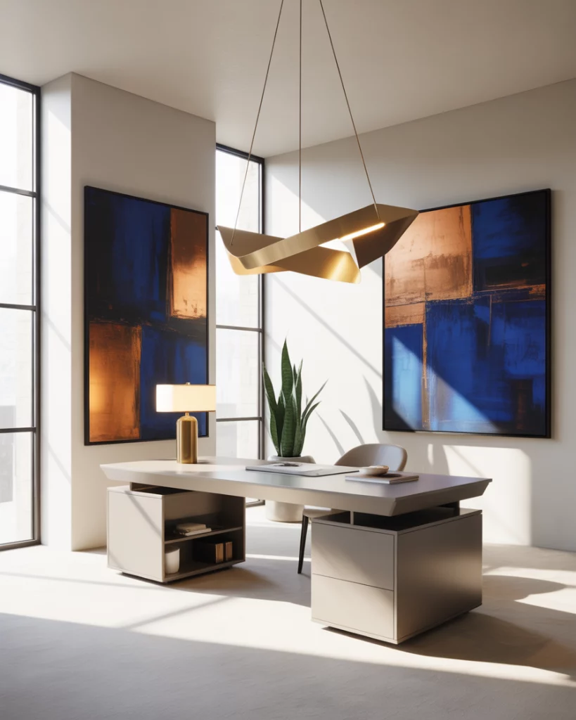A cool, contemporary home office inspired by art galleries features clean walls, bold artwork, and sculptural lighting. The interior feels both creative and disciplined—ideal for designers or architects. Neutral backdrops let color accents and statement pieces stand out. It’s a workspace that motivates innovation every day.