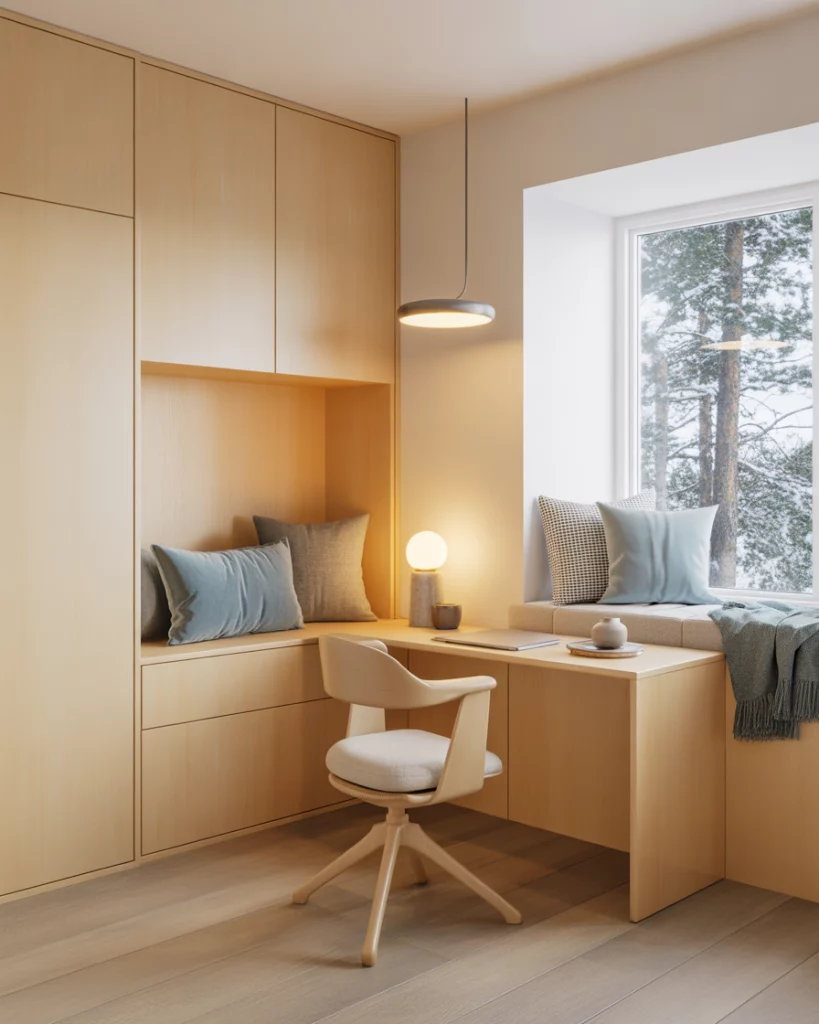 The Scandinavian home office trend focuses on cozy textures, light wood, and soft accent tones like muted blue and pale grey. Add a chunky rug, a cushioned armchair, and warm lighting to balance minimalist furniture. In smaller quarters this feels less cold and more inviting. From Nordic design sources such as Sköna Hem to frontline architects in Copenhagen, the cozy Scandi look is still a favorite in 2026 for interior lovers.
