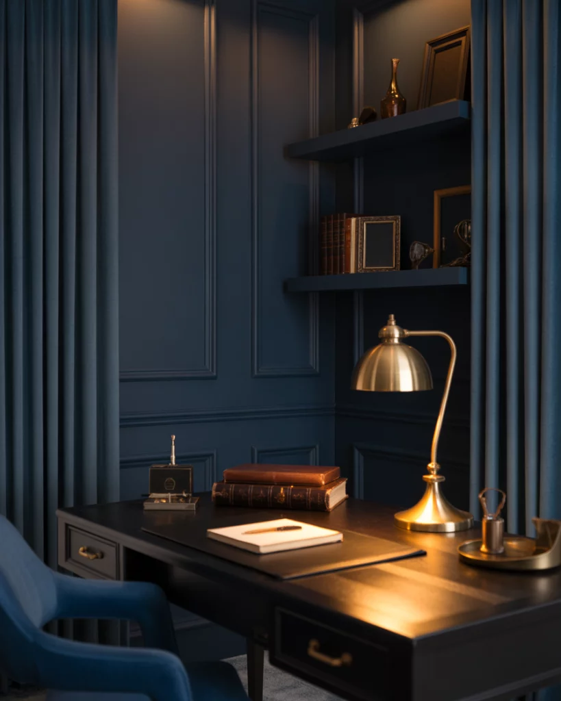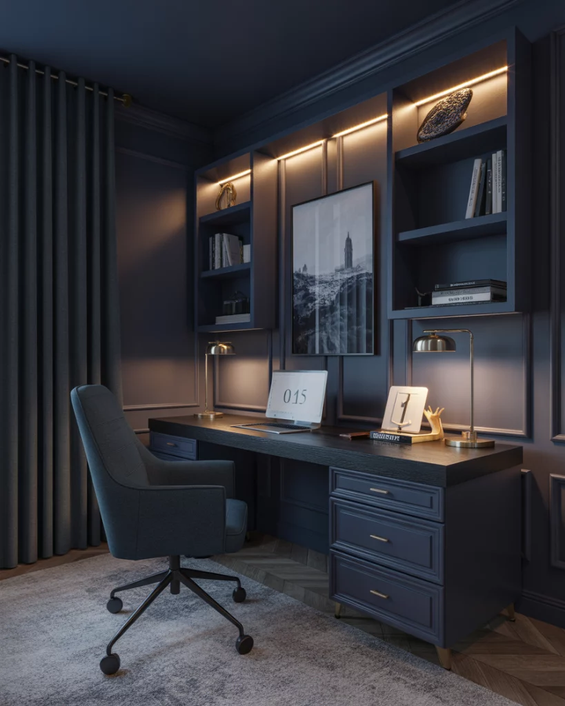 A moody home office goes bold with deep shades—think charcoal walls, dark blue accents, and matte black fixtures. Add contrast via brass hardware or soft light sources. Even in a small space, this style can feel enveloping and luxurious rather than oppressive if balanced well. Some high-end boutique studios now favor this dramatic approach for creative offices.