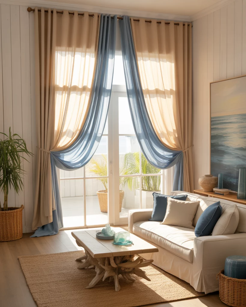 The combination of beige and blue window treatments through double-layered window panels will provide perfect contrast for both warm and cool tones. The light beige will bring in warmth, creating a relaxing setting, and blue will bring in personality and freshness, making for perfect interior decor for a modern home that adds a coastal or Sweden home décor setting to the interior design philosophy. The layered look not only enhances privacy but also gives a sense of thoughtful design balance.