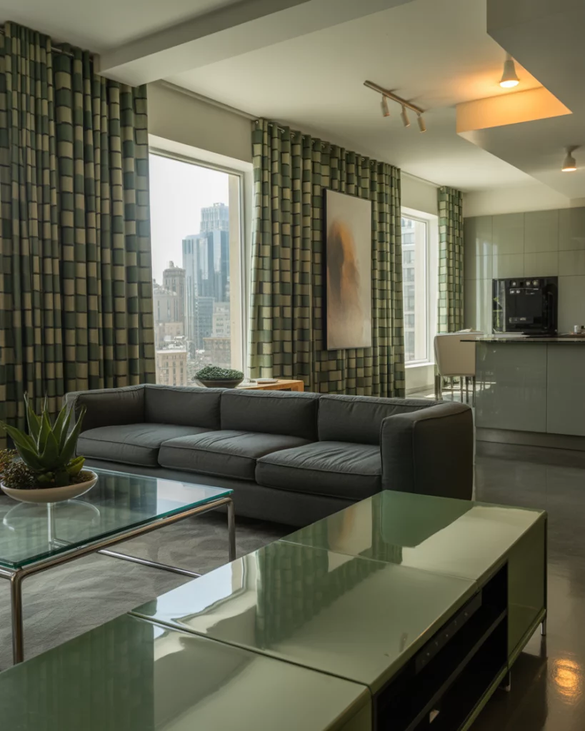 If your goal is a modern and stylish vibe, geometric green and grey patterned curtains are a daring yet tasteful choice. Perfect for city apartments or contemporary homes, this combination adds energy while keeping things sophisticated. The muted tones of grey balance the liveliness of green, creating a visual rhythm that matches clean architectural lines and metal or wood accents.