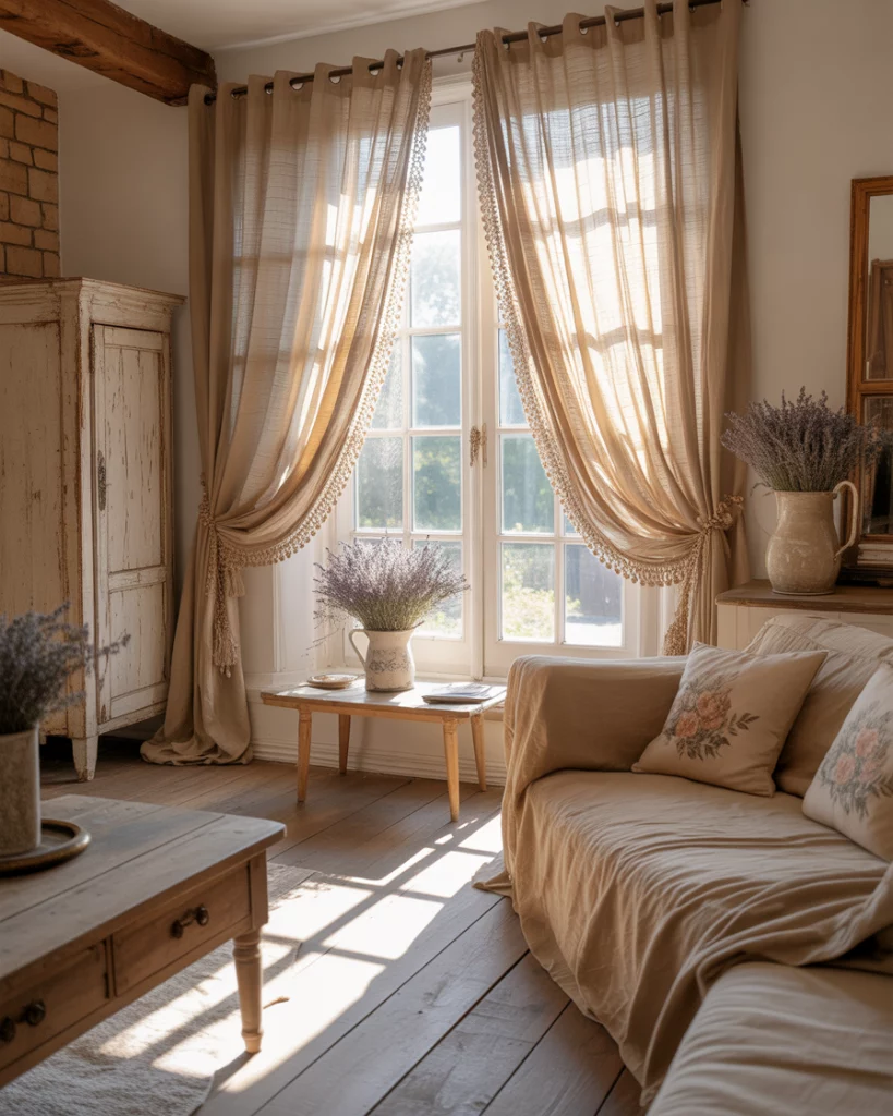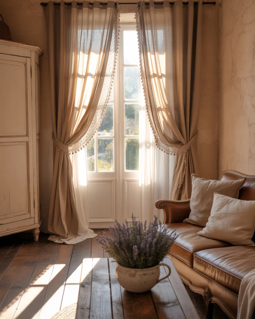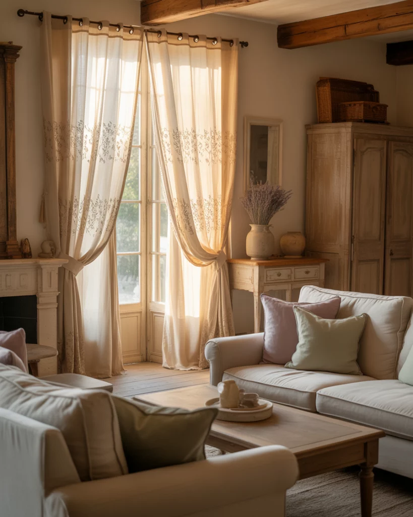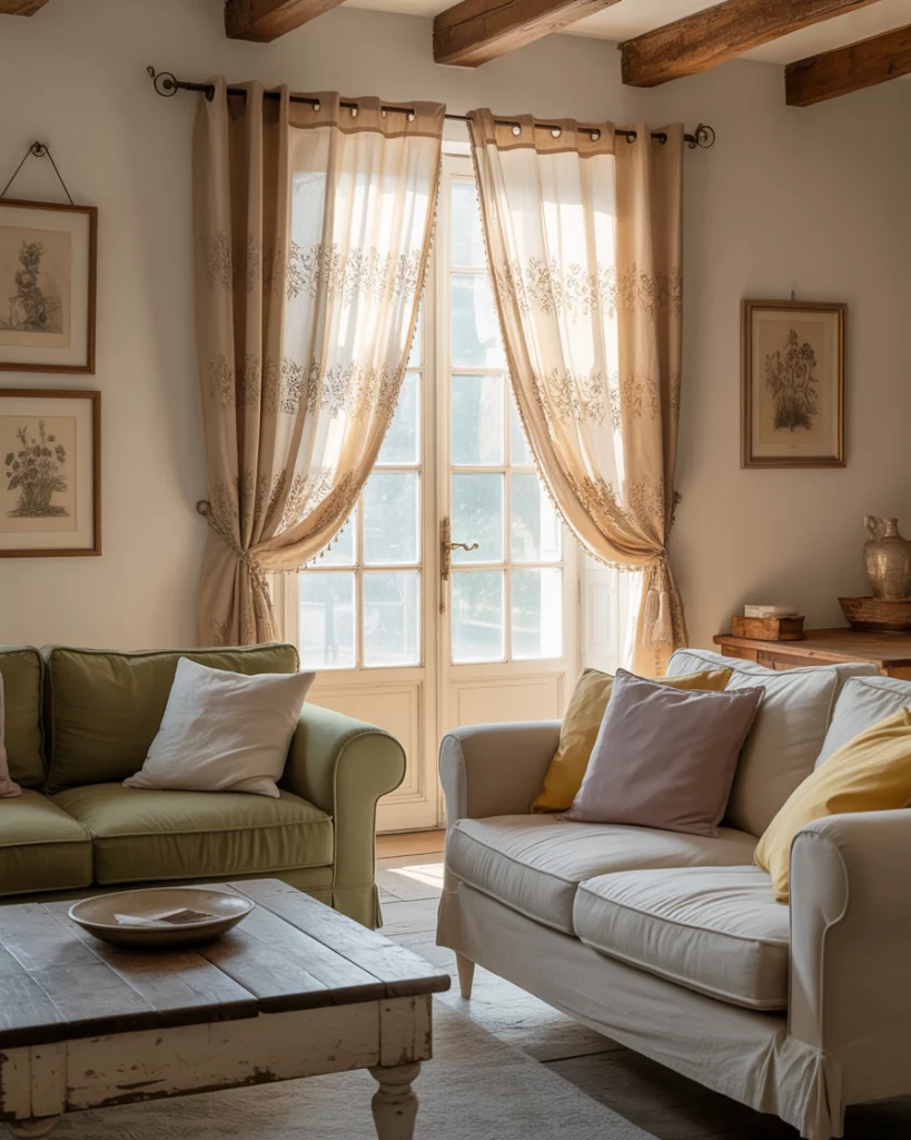 Channeling the gentle beauty of French country interiors, combine beige and white fabrics with soft pleats or subtle lace trim. These curtains create a tranquil, nostalgic feel ideal for cottages or suburban homes that want warmth without clutter. The light color palette enhances brightness, while the tactile fabric details keep the room charming and inviting.