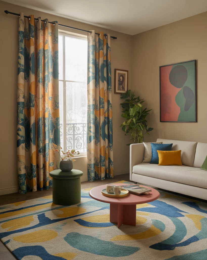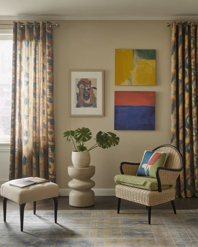 For individuals that like bold expression, any type of patterned colorful curtain will provide an aesthetic that’s both playful and vibrant, from patterned abstract blue, yellow, and green that will add a dash of home decor eccentricity that’s both beautiful and vibrant-looking. Keep furniture minimal so the curtains can shine as your main design statement.