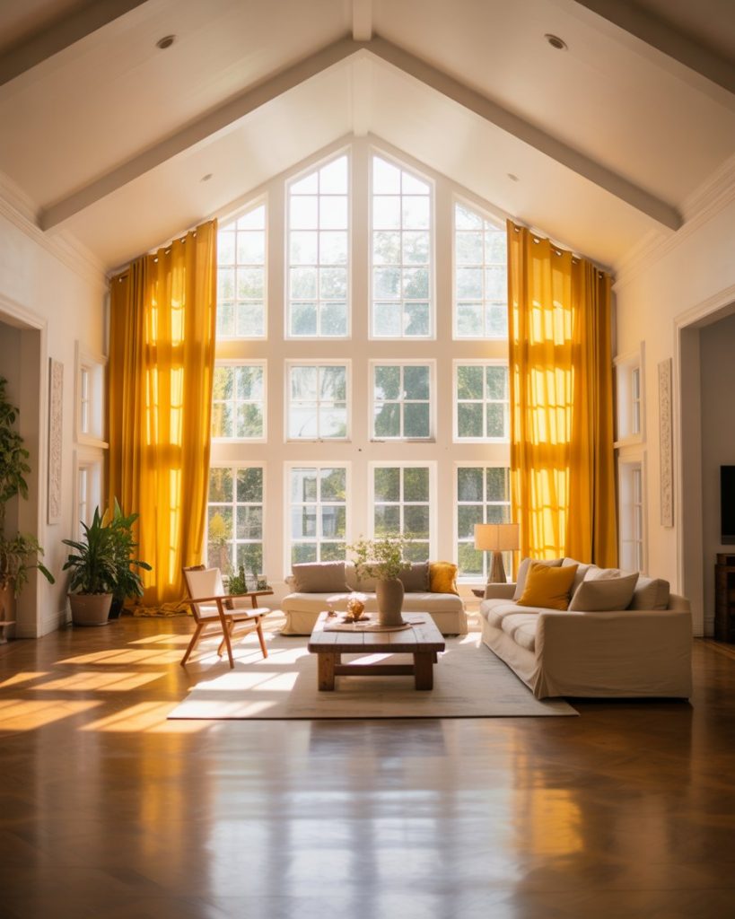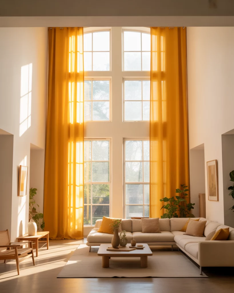 To add a burst of dynamism in your living room, choose yellow floor-to-ceiling curtains for a high-ceilinged room. The bright yellow will starkly contrast, accentuating the windows, while the floor-to-ceiling drapes will create vertical lines, making your room look taller and larger. To modulate it for contemporary home décor, keep it simple by painting your walls white, cream, or beige, and use yellow floor-to-ceiling curtains as the accent accessory. One home décor experience: I once visited my friend’s loft, and his yellow drapes immediately lifted the ambiance, making me linger longer than expected, feeling so happy.