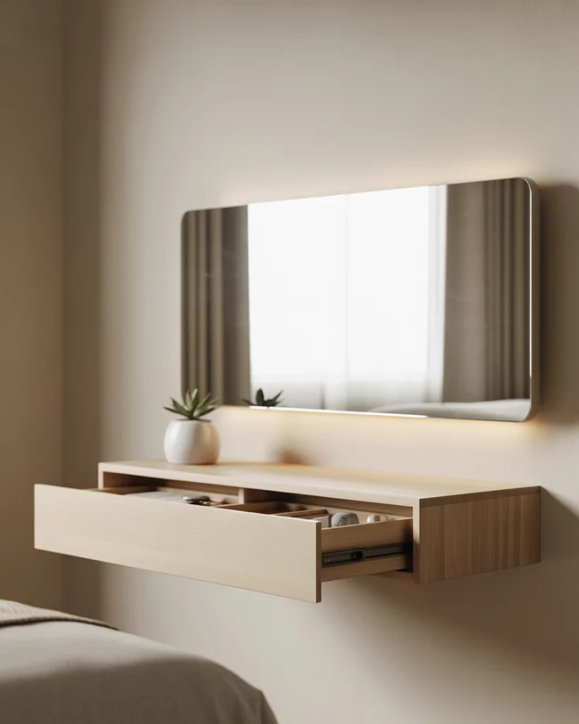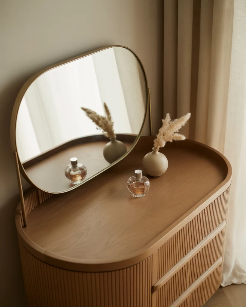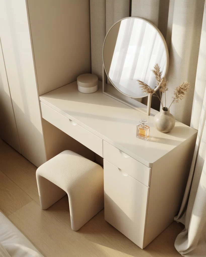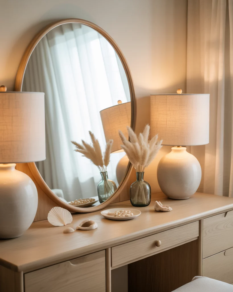 A coastal, softly elegant vanity with pale wood tones feels like fresh sea air indoors. After staying at a beach rental in Charleston, I fell in love with their airy palettes—creamy beiges, woven textures, and organic curves. This approach suits both large bedrooms and compact spaces craving serenity. It’s calm, timeless, and easy to pair with existing decor.