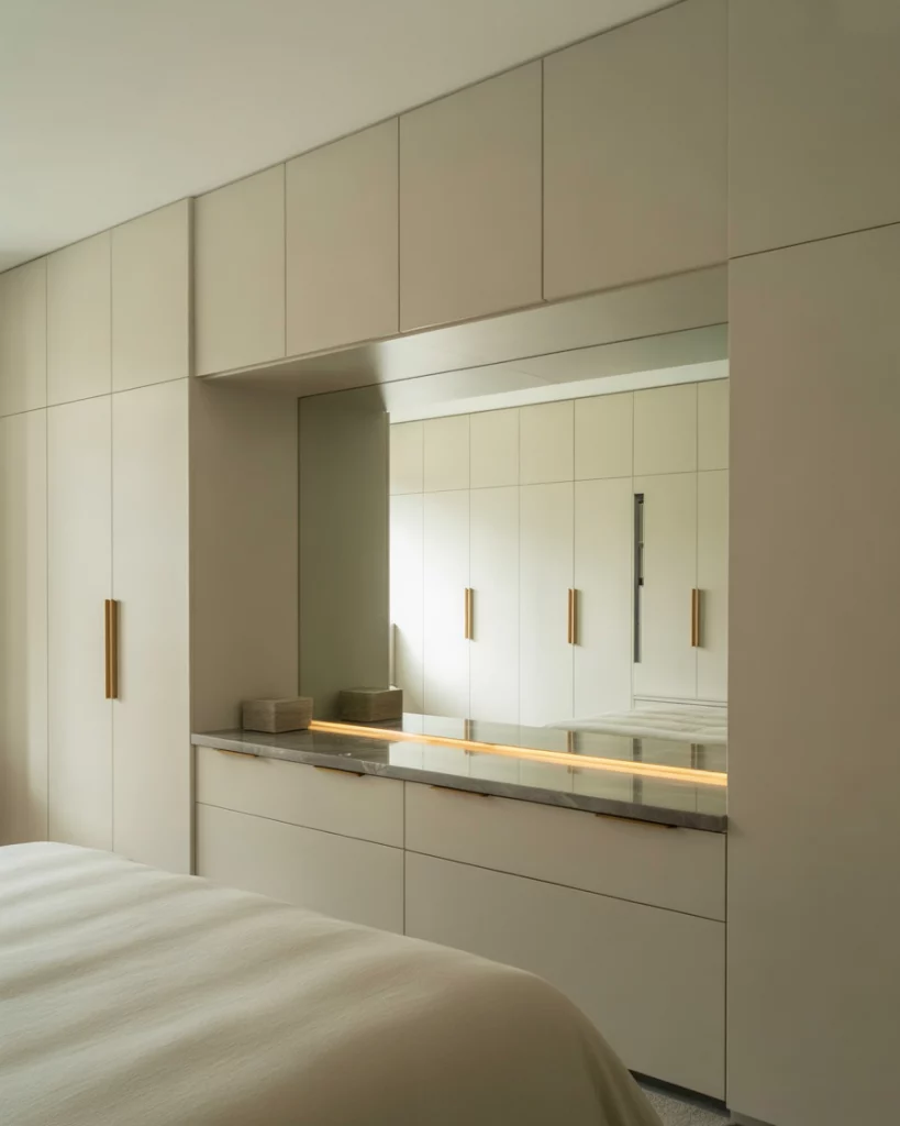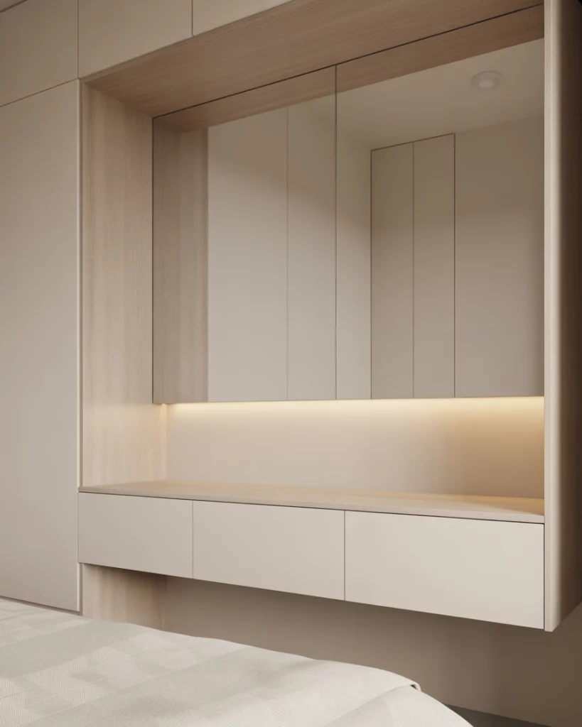 And then there’s the ultimate organizer’s dream—an integrated, heavily built-in, and hidden-compartment-filled wall vanity system. So, one such home tour that impressed me was at this model home, and their seamlessly designed cabinetry made the whole area seem like it had been curated. This system lets you hide all your tools, palettes, and accessories without leaving anything behind, and it’s perfect for those seeking utter calm and control over their environments.