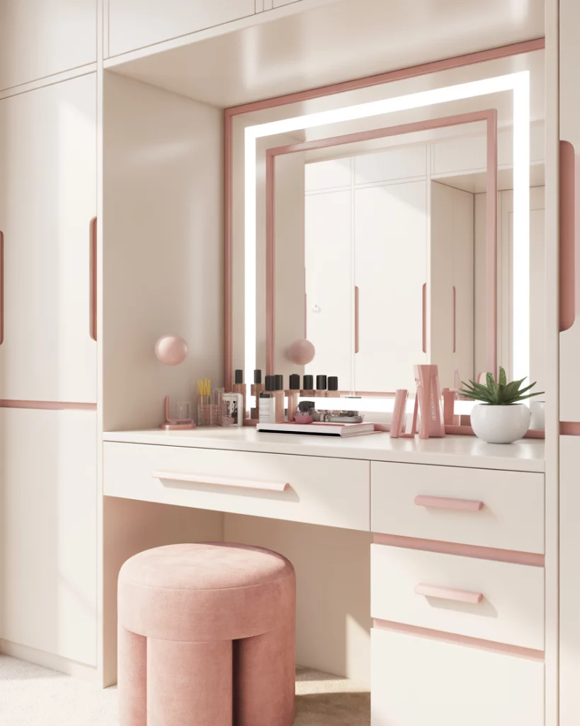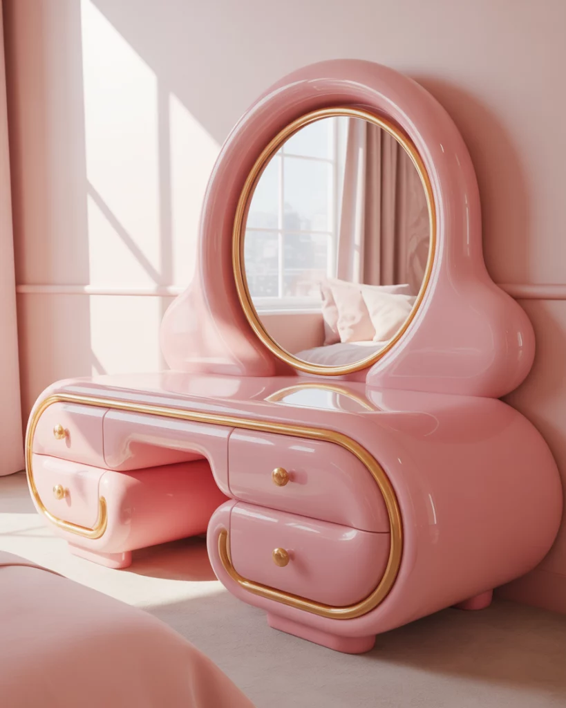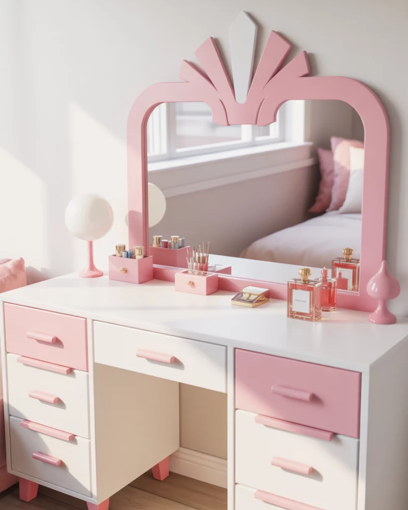 A pink, gently playful vanity nods to Toca Boca color schemes, blending youthfulness with grown-up practicality. I once integrated this look for a friend who wanted something cheerful without leaning childish—soft blush drawers, rounded edges, and gold handles made it feel uplifting. Great for anyone who wants color in a refined, modern way.