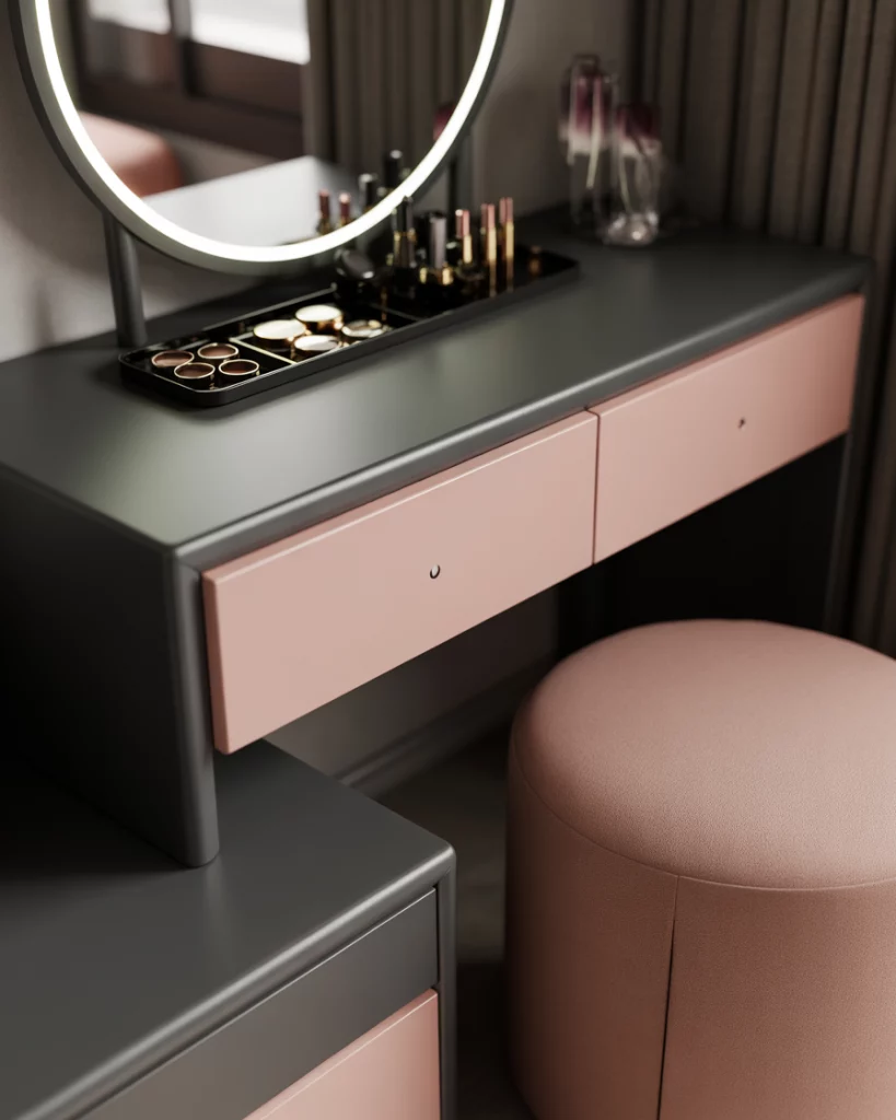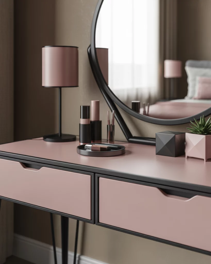 The contrast of pink and black creates a confidently classy vanity that stands out without overwhelming the room. I saw this combo in a Brooklyn studio—soft pink drawers softened by a deep black frame—and it felt surprisingly grown-up. Use matte finishes and simple hardware to keep the look polished and modern while still fun.