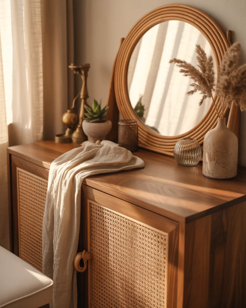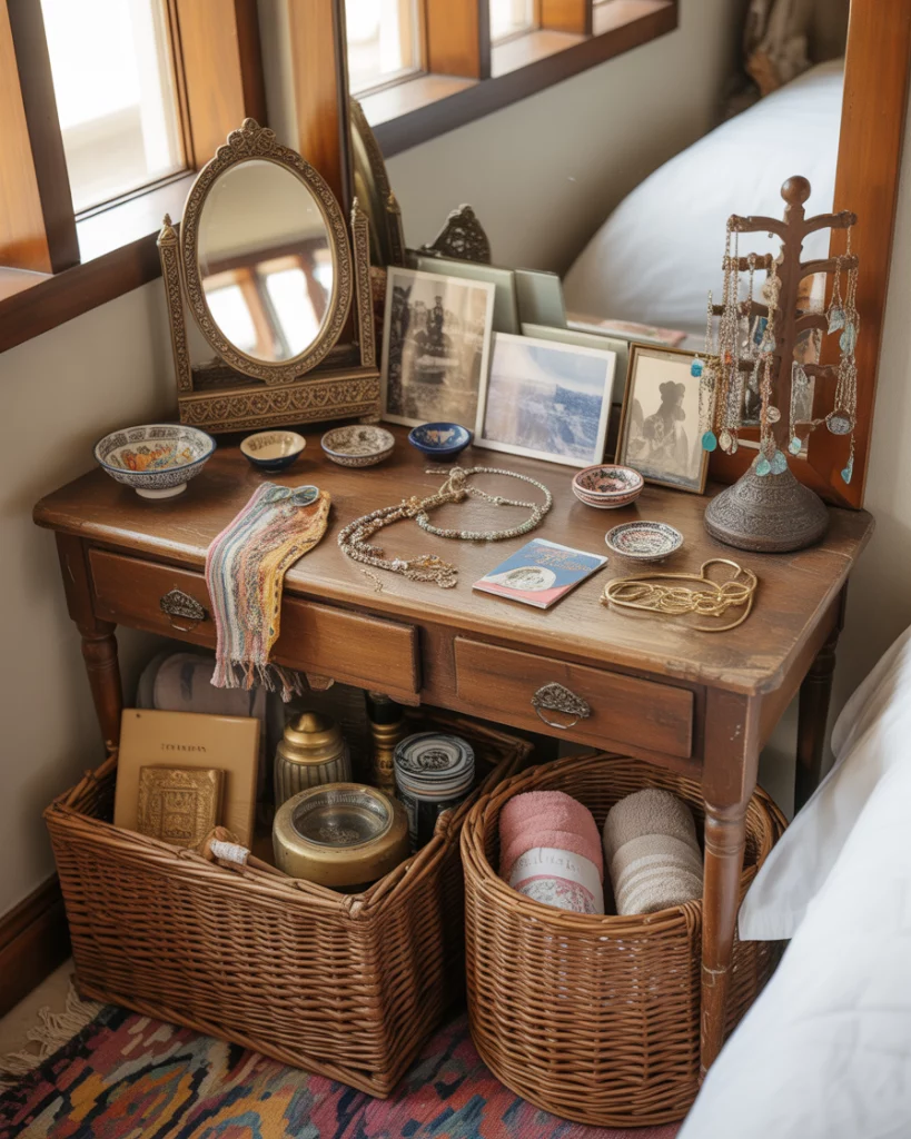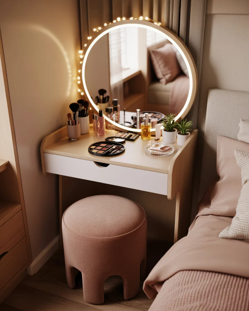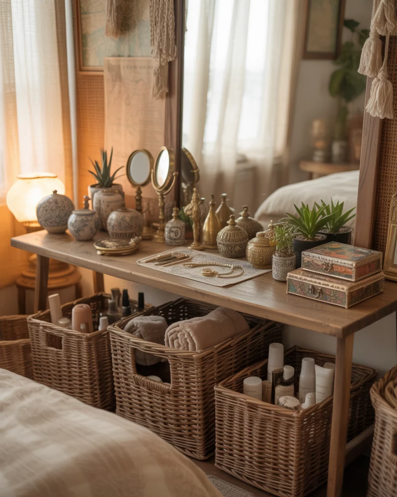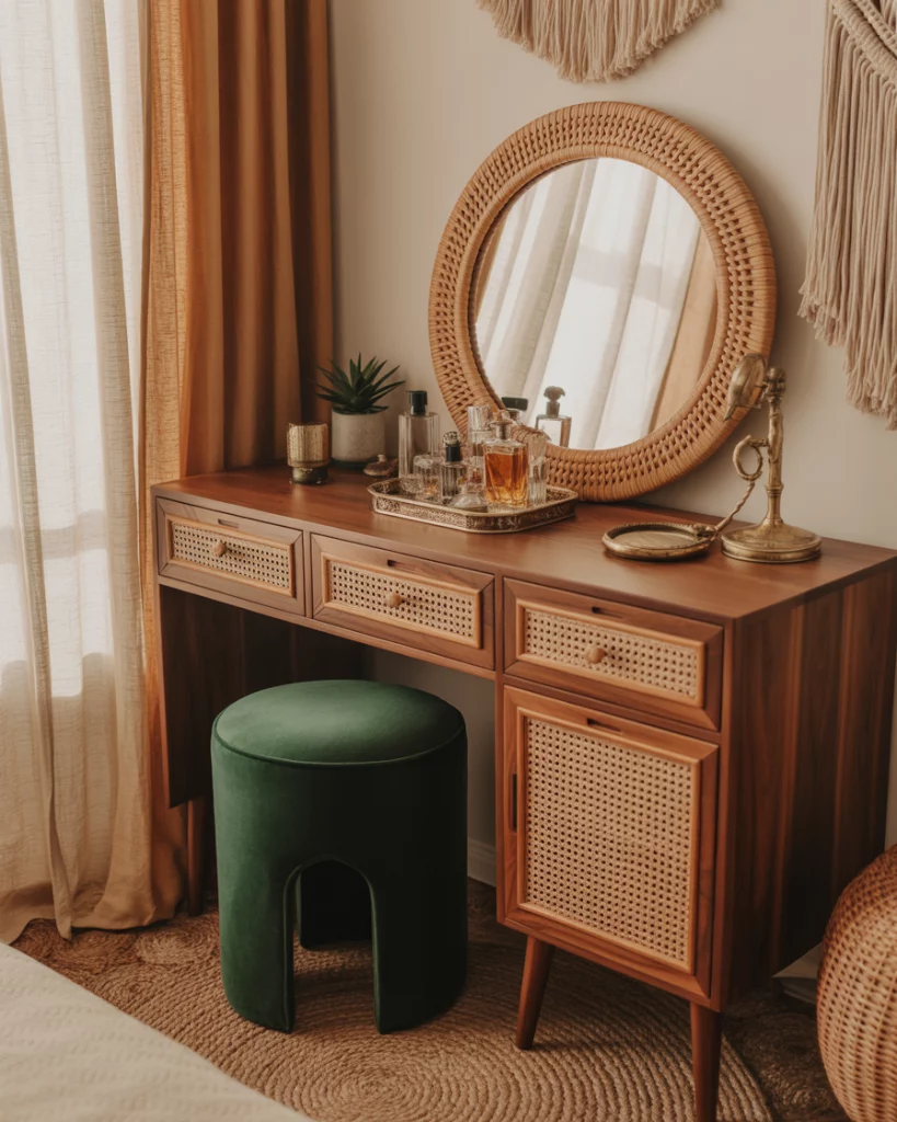 For the free-spirited decorator, a Bohemian, classy vanity mixes cane textures, natural woods, and soft fabric poufs. I saw a version at a flea market makeover hosted by a local designer—warm, layered, artistic. It works beautifully alongside macramé, earth tones, or vintage mirrors. This style turns a makeup corner into a peaceful creative ritual.