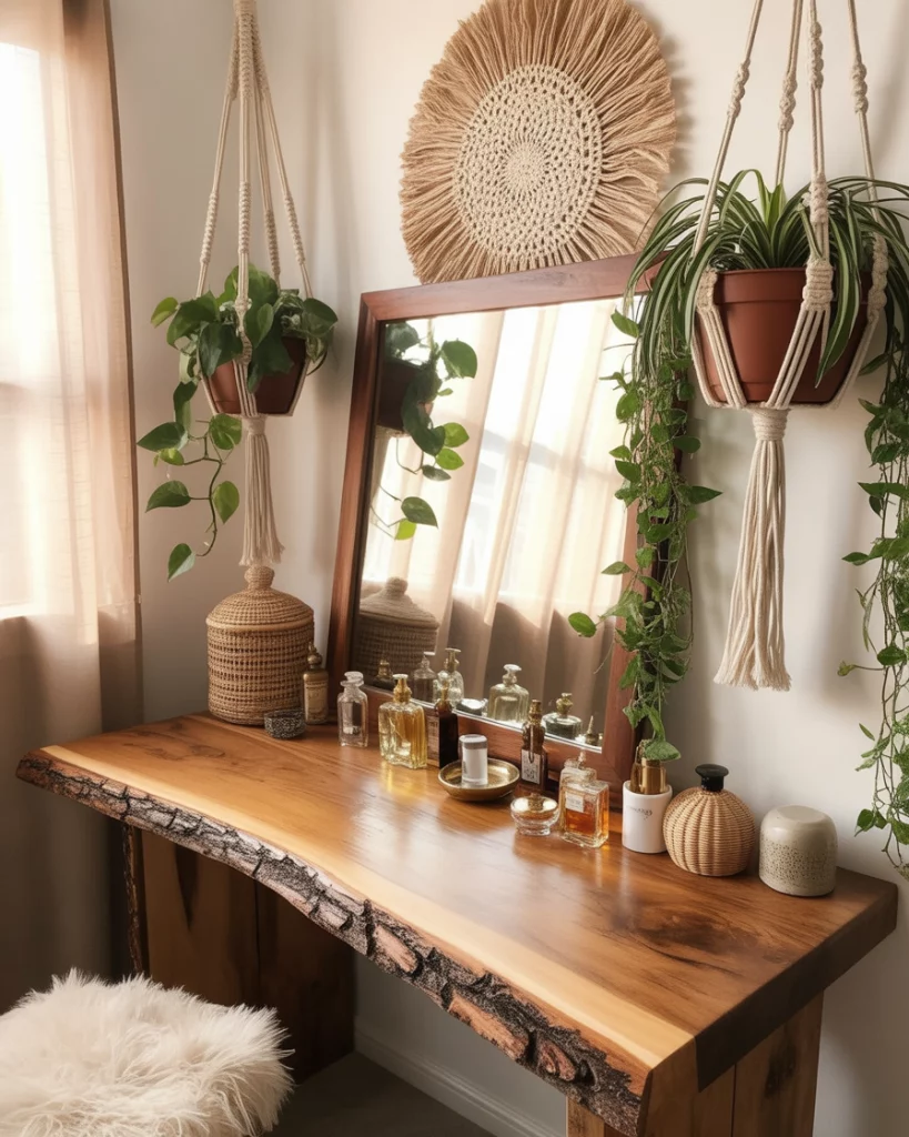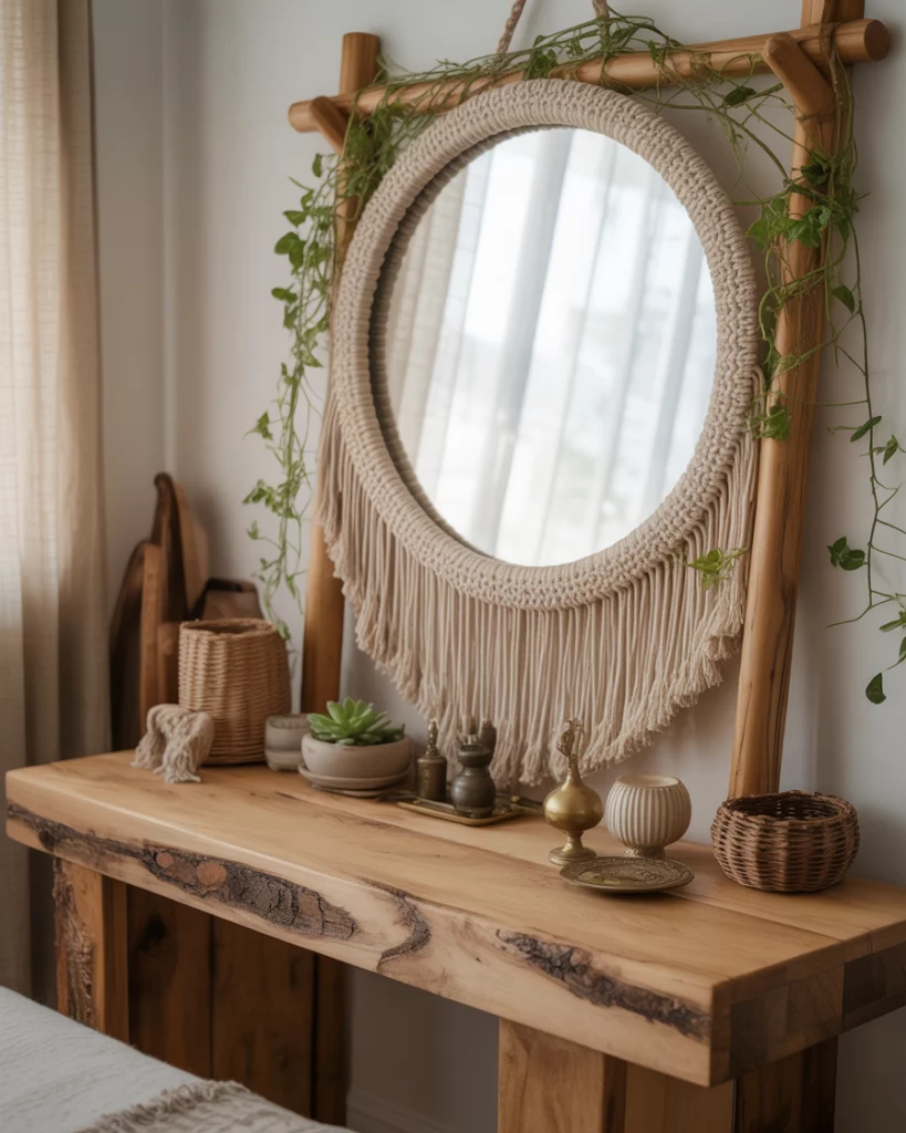 20. Bohemian DIY Vanity With Macramé and Natural Wood